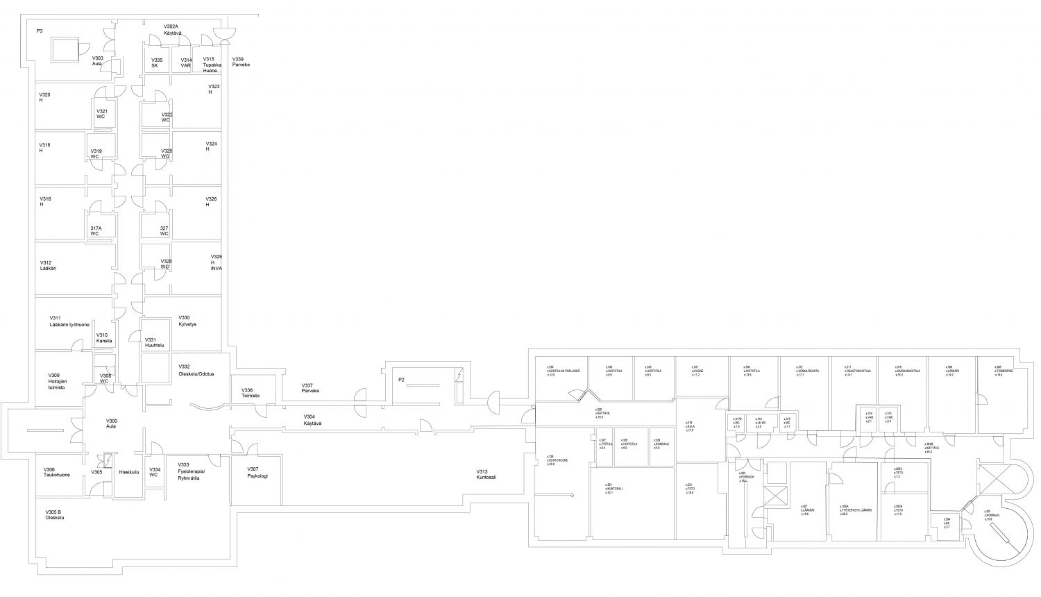 - kellari, 784 m2, hoitotiloja, allashuone kahdella saunaosastolla, kaksi erillistä pukuhuone- ja pesutilaa, varastotiloja