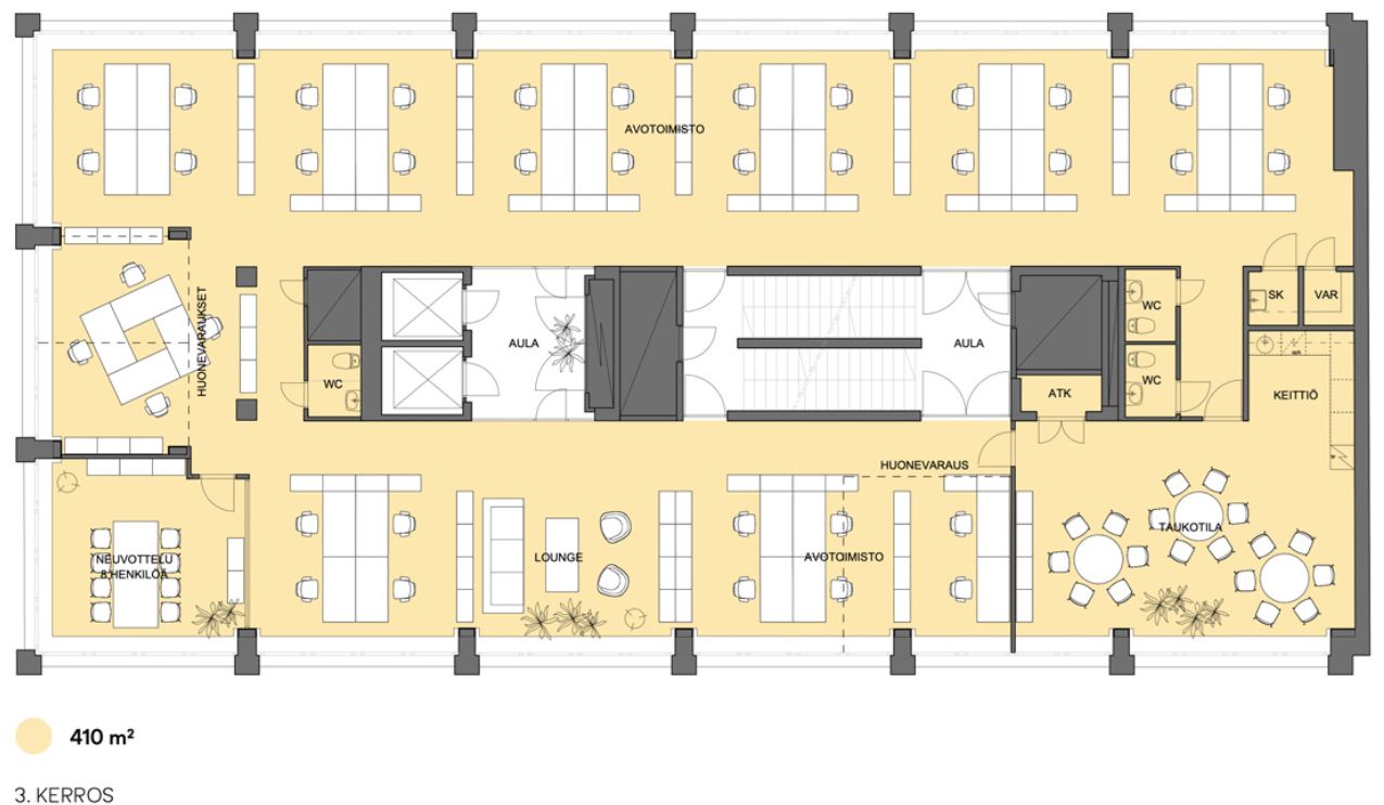 Ruoholahdenkatu 14 kolmannen kerroksen 410 m²:n toimistokokonaisuus tarjoaa valoisat ja tehokkaat puitteet aivan Kampin ytimessä. Tilassa on laaja avotoimistoalue, useita erillisiä työ- ja neuvotteluhuoneita, edustava huonevarauksella varustettu neuvottelutila, viihtyisä lounge-alue sekä tilava taukotila keittiön yhteydessä. Useat wc-tilat, oma keittiö ja selkeä aulavyöhyke tekevät arjesta sujuvaa. Suuret ikkunat tuovat runsaasti luonnonvaloa, ja 60-luvun arkkitehtuurin yksityiskohdat luovat tilaan persoonallista ilmettä.
