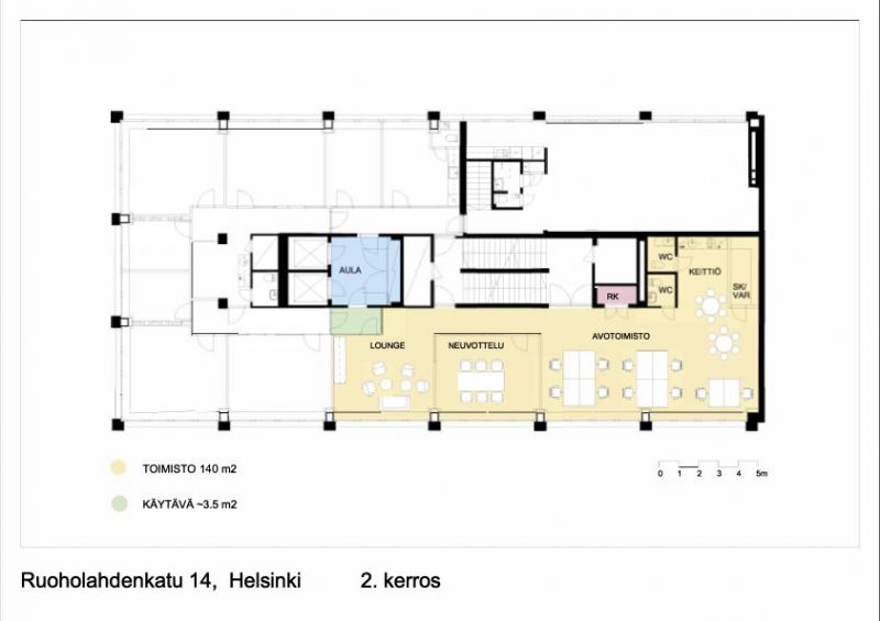 Ruoholahdenkatu 14 tarjoaa modernit ja muunneltavat toimistotilat Helsingin Kampissa, aivan Lastenlehdon puiston ja Kampin keskustorin tuntumassa. Toisen kerroksen 140 m²:n toimistossa on avotoimistoa, viihtyisä lounge, neuvotteluhuone, wc-tilat ja oma keittiö. Koko seinän levyisistä ikkunoista tulvii luonnonvaloa, ja alkuperäiset tiikkiset ikkunapenkit ja karmit tuovat tilaan lämpöä ja persoonallisuutta.