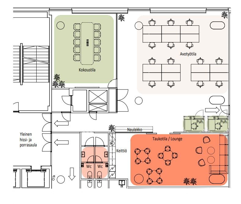 Toimistossa on modernit tilaratkaisut ja korkeatasoiset materiaalit, jotka luovat viihtyisän ja toimivan työympäristön. Tilasta löytyy myös erinomaiset tekniset valmiudet sekä tarvittavat sosiaalitilat, kuten keittiö ja wc-tilat.