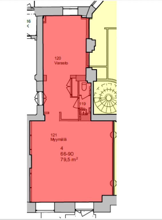 Tämä 79,5 m² liiketila sijaitsee kiinteistön kivijalassa. Tila on avonainen, ja siihen on oma sisäänkäynti suoraan kadulta. Tilaan kuuluu avaran myymälätilan lisäksi takaosan varastotilaa ja oma wc-tila. Vapautuminen 31.10.2026 tai sopimuksen mukaan. Ei sovellu ravintola-, kahvila- tai parturikampaamotoimintaan. This premise is not suitable for a restaurant, cafeteria or a barber shop.