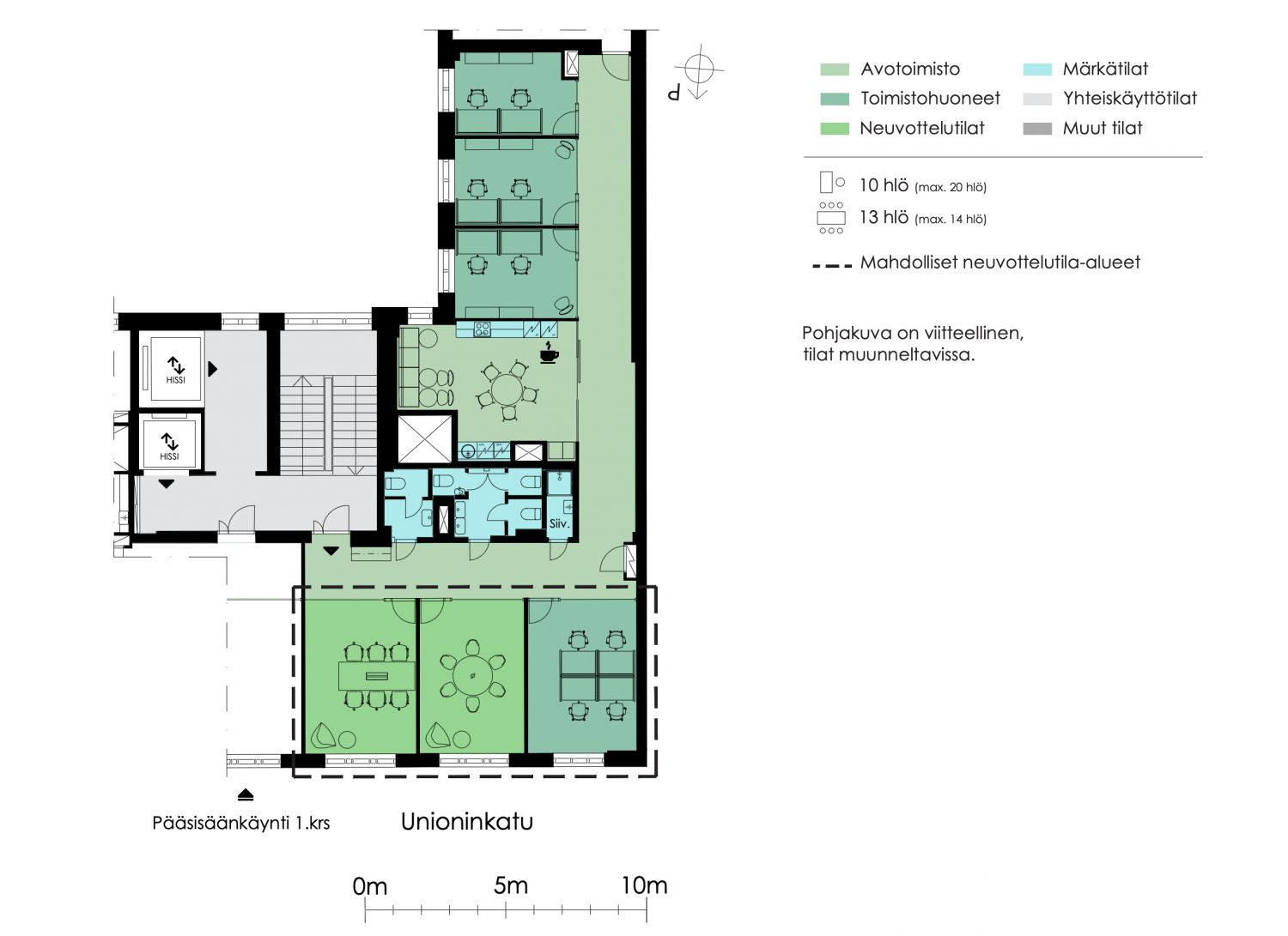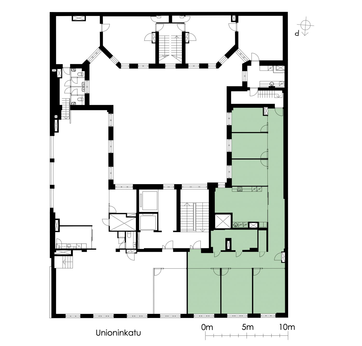 4. kerroksen toimistotila, jossa toimistohuoneita ja neuvottelutilaa. Näkymät Unioninkadulle ja sisäpihalle.