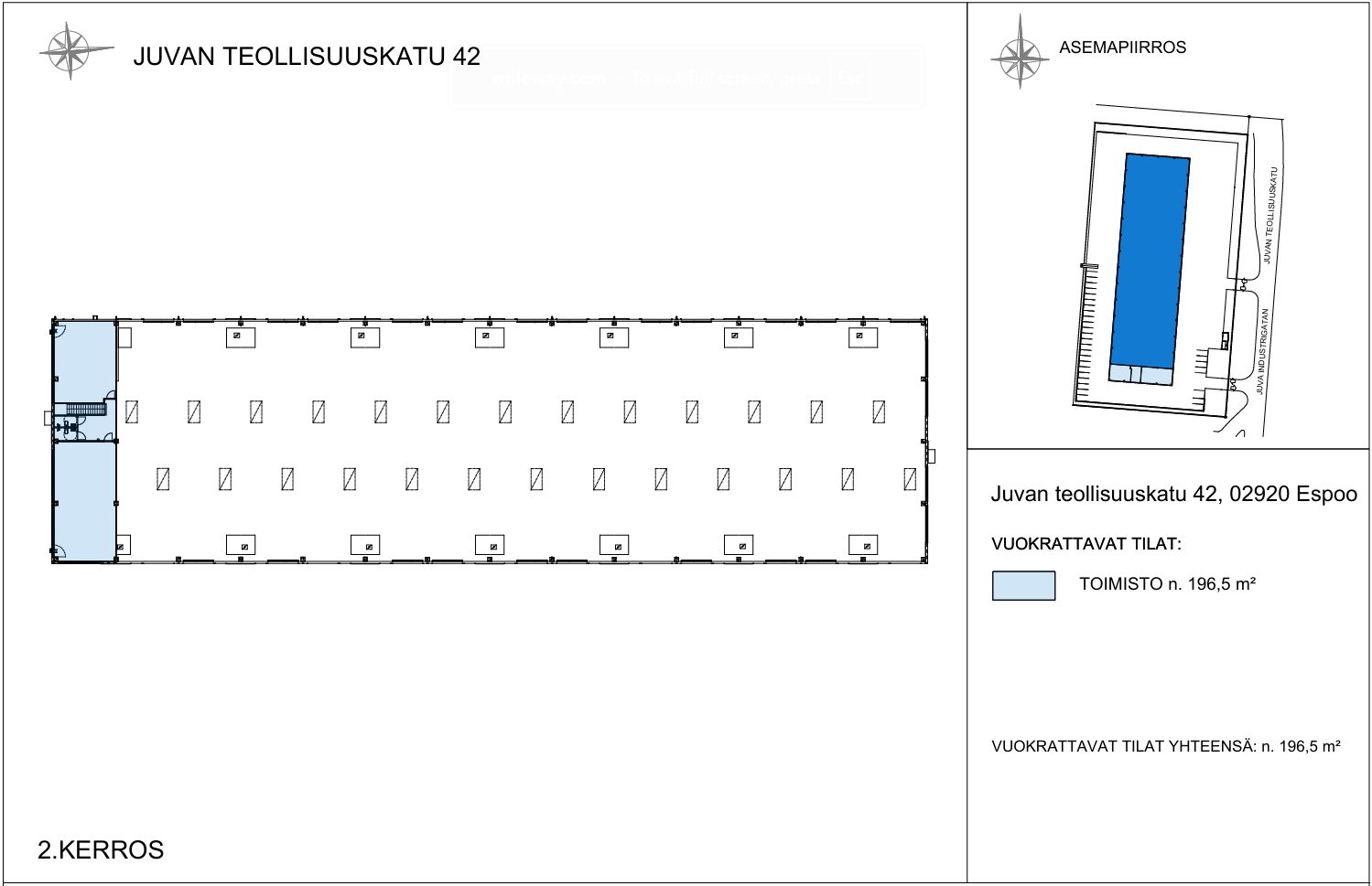 Moderni ja moneen taipuva Juvan Teollisuuskatu 42 on huipputason last-mile- kohde Espoon Juvankartanon alueella, vain lyhyen matkan päässä Kehä III:lta. Moderniin läpiajettavaan halliin kuuluu useita nosto-ovia maantasossa sekä siistit toimistotilat eteläpäädyssä. Laajalla piha-alueella on helppo liikkua ja operoida raskaallakin ajoneuvokalustolla, ja tarjolla on mukavasti tilaa pysäköinnille ja lastaukselle. Kohde sopii sijainnin, toimivan pohjaratkaisun sekä tilavan pihansa ansiosta loistavasti monenlaiseen logistiikka-, varastointi- ja jakelutoimintaan.