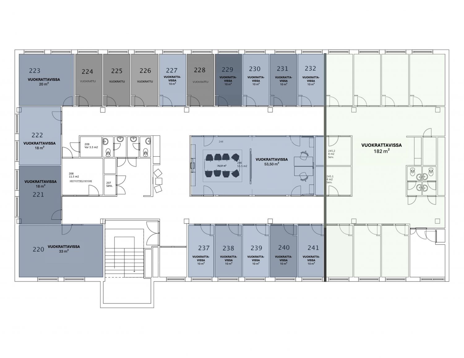 Erikokoisia toimistohuoneita tarjolla joustavasti 10–53,5 m² kokoisina. Näitä on myös mahdollista yhdistää isommaksi kokonaisuudeksi.