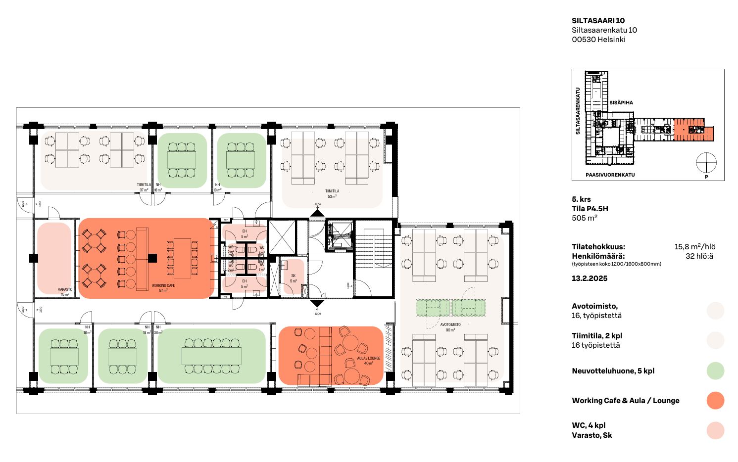 Tila on hiljattain remontoitu ja tarjoaa 505 m² tyylikästä, valmista toimistotilaa viidennessä kerroksessa. Ratkaisu sopii joustavasti noin 25–70 hengen tiimille ja tarjoaa puitteet tehokkaaseen, viihtyisään ja moderniin työskentelyyn keskellä kehittyvää Hakaniemeä.