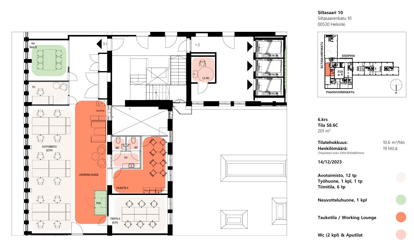 Remontoitu ja muuttovalmis toimisto kuudennessa kerroksessa tarjoaa modernit ja monipuoliset puitteet 10-20 hengen työskentelyyn. Tilan pohjaratkaisu yhdistää avotilan, inspiroivan työkahvilan, tiimitilan, työhuoneen ja kuuden hengen neuvotteluhuoneen tehokkaaksi kokonaisuudeksi. Käytössä on lisäksi keittiö sekä kaksi WC:tä. Kerroksessa sijaitsee myös LE-WC.