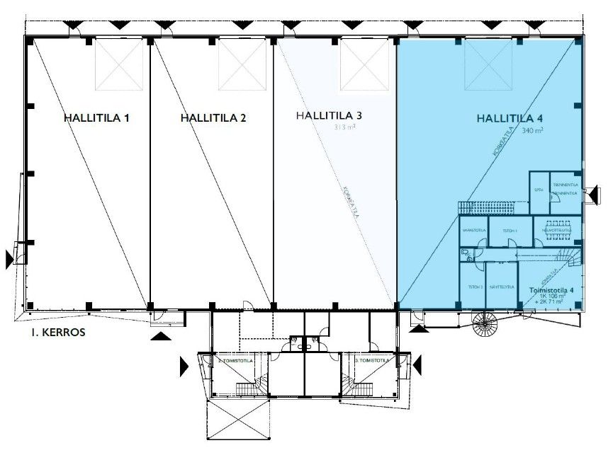 Tilasta on saatavilla tarpeen mukaan yhteensä noin 1250m2 korkeaa hallitilaa josta löytyy 4kpl nosto-ovia. Toimistotilaa on saatavilla parhaillaan noin 300m2.