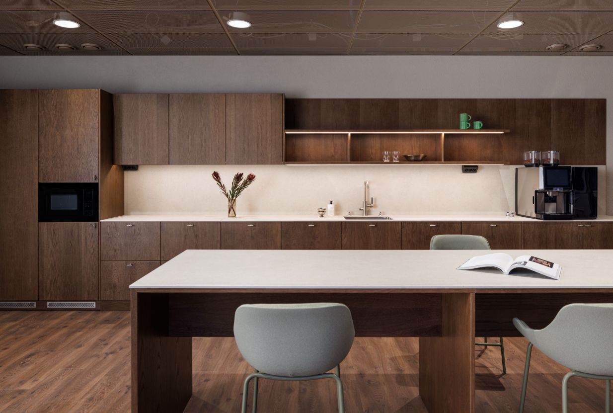 Kuvista poiketen tilassa on näyttävä punertava keittiökokonaisuus, joka tuo tilaan särmää ja lämminhenkistä tunnelmaa. Pohjaratkaisuun kuuluu viihtyisä aula, kolme erikokoista työhuonetta tai neuvottelutilaa, keittiö/taukotila sekä neljä WC:tä. Kokonaispinta-ala on 277,5 m², ja tila soveltuu noin 20–50 hengen tiimille.