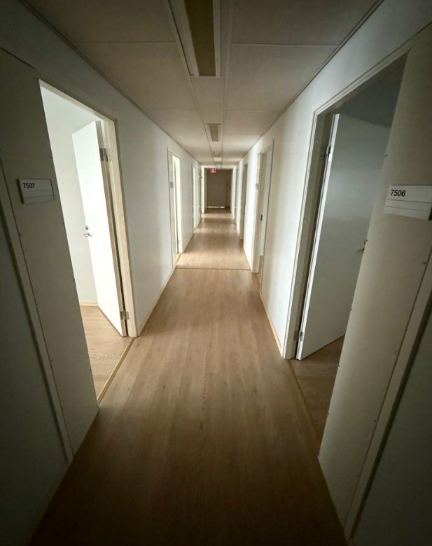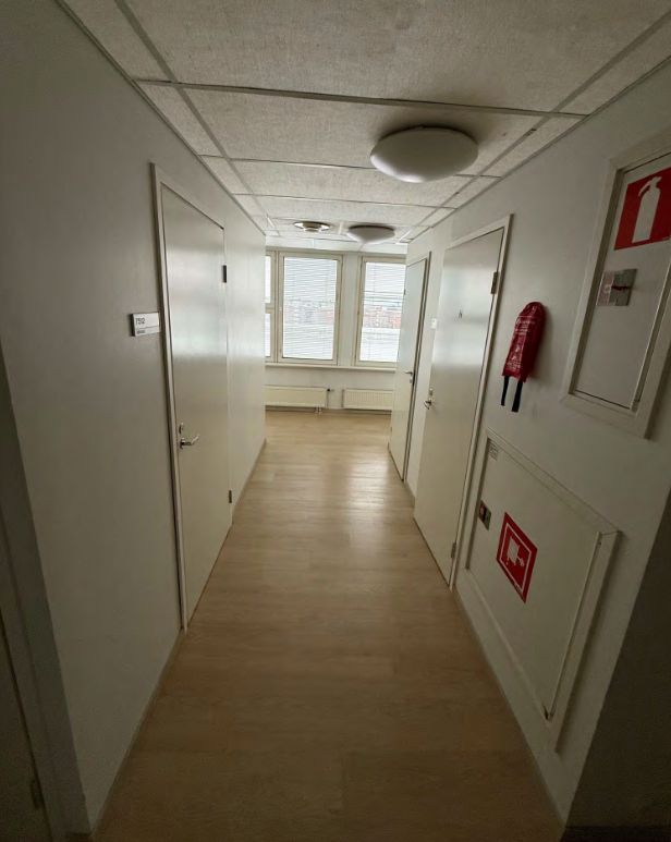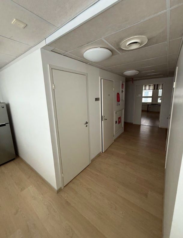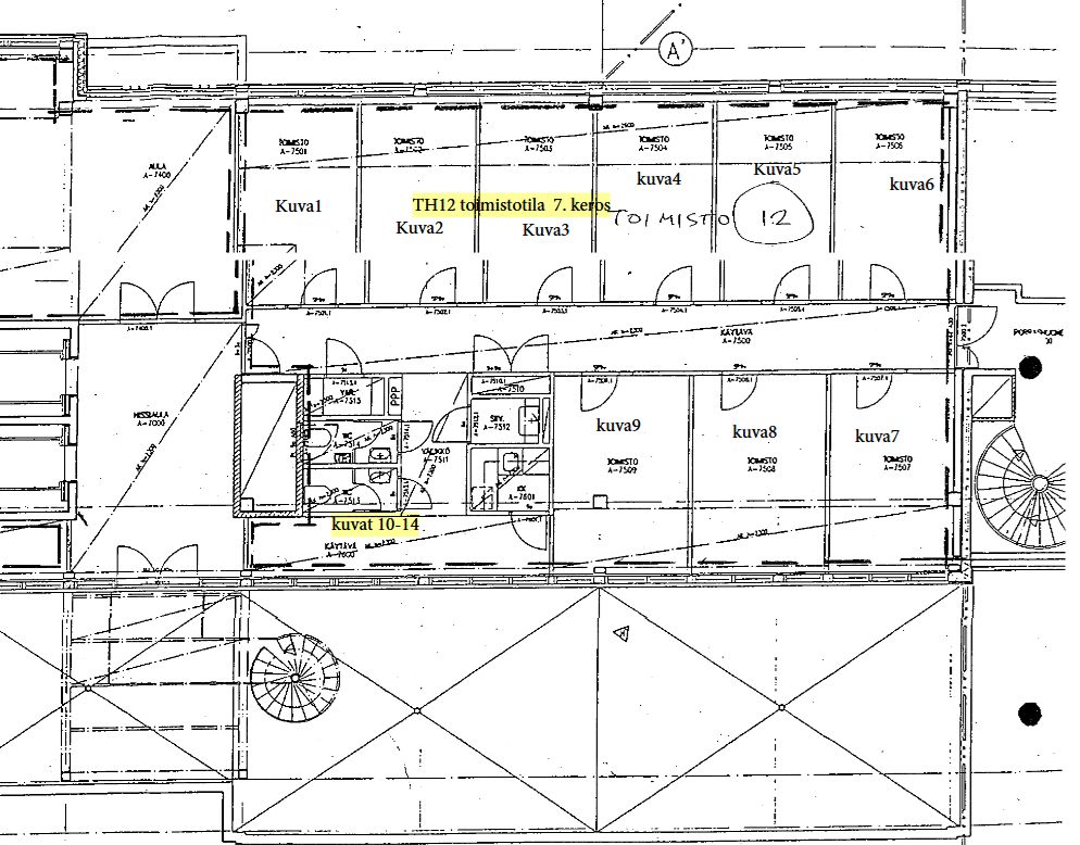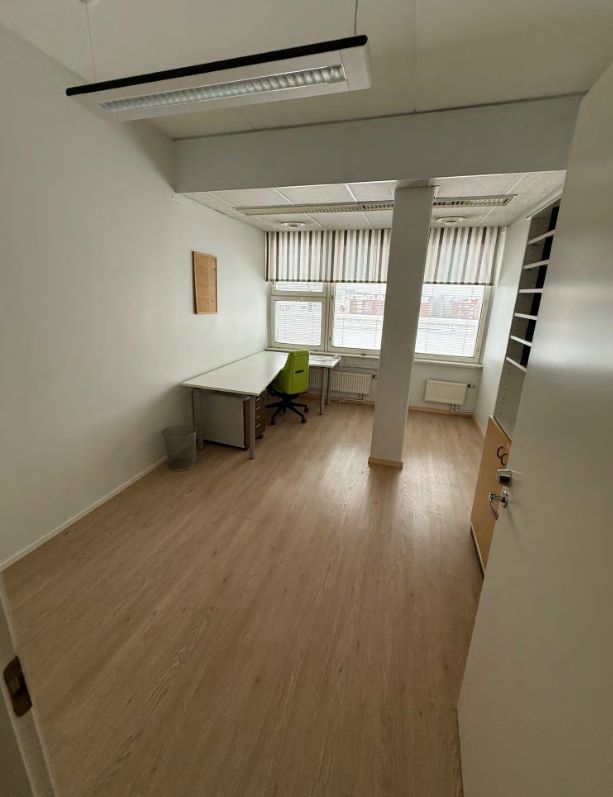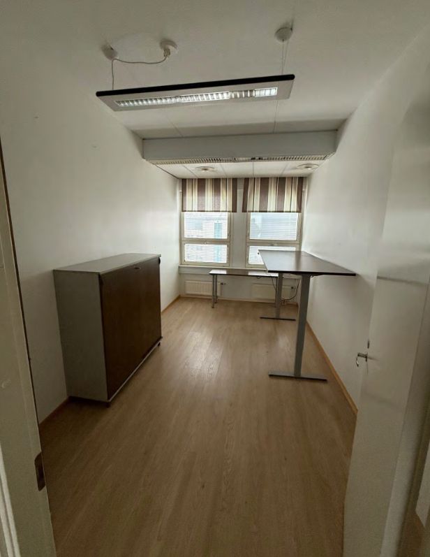 Tiloissa useampi toimistohuone, wc-tilat sekä keittiö.