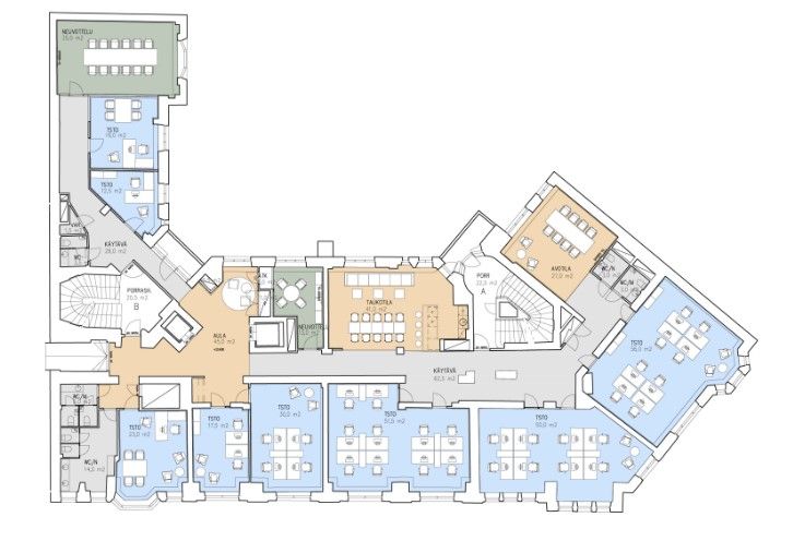 Tämä valoisa jugendtyylinen toimisto kattaa kokonaisen oman kerroksen. Käytävillä ja yhteistiloissa on arvokas koriparketti. Kokonaisuus sisältää useita eri kokoisia huoneita, joten tila on helppo jakaa erilaisiin käyttötarkoituksiin ja eri kokoisille tiimeille. Tilassa on reilun kokoinen taukokeittiö, omat wc:t ja hissiaula. Kuudennen kerroksen maisemat avautuvat Lapinlahdenpuistikkoon. Hauskana yksityiskohtana vihreä alkuperäinen kakluuni yhden työtilan yhteydessä.