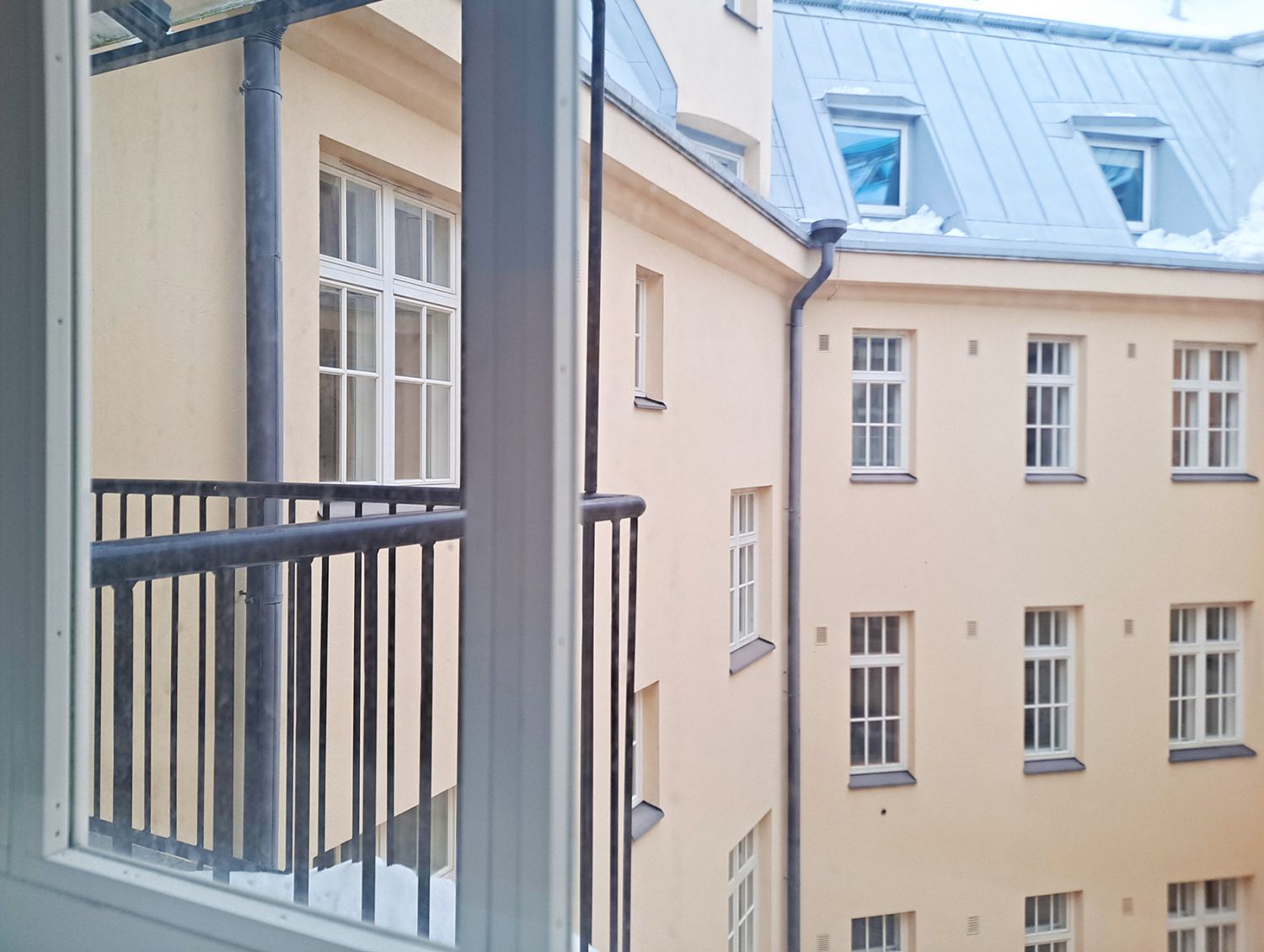 Huoneisto on läpitalon huoneisto ja siinä on myös pieni parveke ja paljon ikkunanäkymää rakennuksen sisäpihan suuntaan.