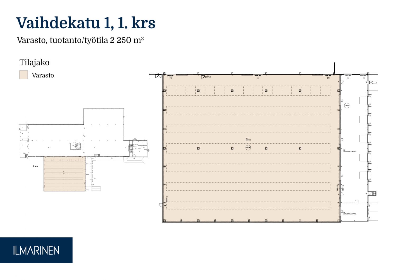 Vuokrattavana 2 250 m² korkeaa varastotilaa keskeisellä sijainnilla Lahdentien tuntumassa. Tilan vapaa korkeus on noin 12 metriä, mikä mahdollistaa tehokkaan varastoinnin. Pysäköintipaikkoja on kiinteistön piha-alueella useassa kohdassa.