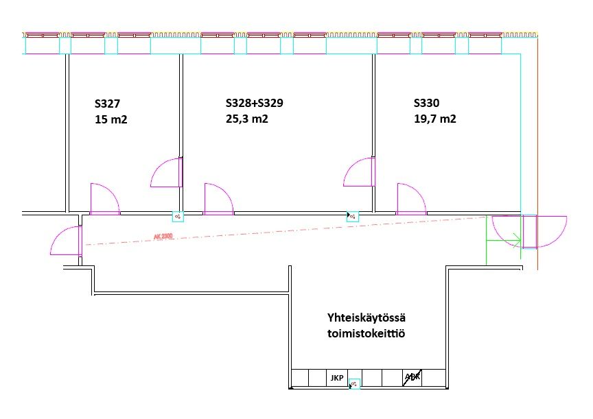 Oman toimistohuoneen lisäksi yhteiskäytössä on kahvihuone/toimistokeittiö, neukkari, taukotilat, vessat ja suihkutilat.