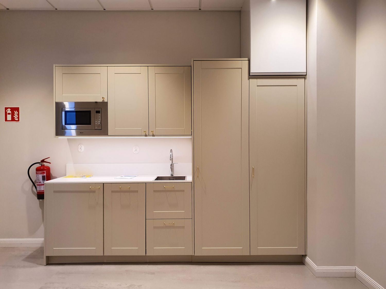 Astut suoraan kadulta tuulikaapin kautta avotilaan, jossa iso näyteikkuna kadulle. Takaosassa reilun kokonen taukotila, missä hyvin varusteltu design-keittiö ja WC-tila.