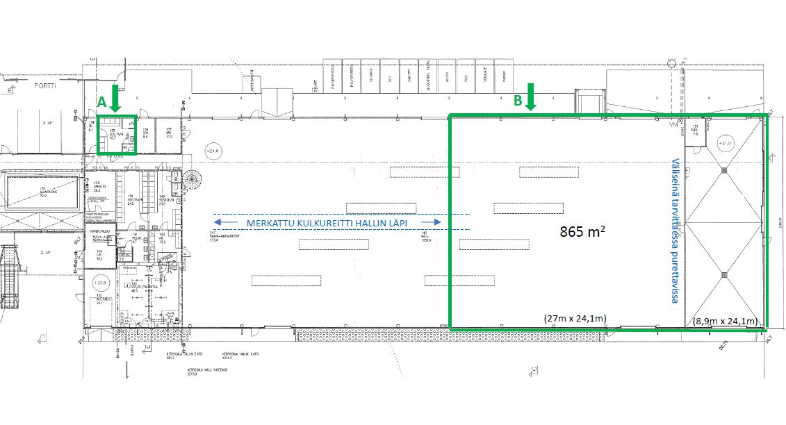 Kohteesta vuokrataan 865m2 tuotantotilaa, joka jakautuu 650m2 tilaan ja 215m2 korjaamohalliin. Lisäksi on mahdollisuus vuokrata toimistotilaa 167m2. Tuotantotilaan on isot nosto-ovet ja läpiajomahdollisuus. Valaistus on hyvä ja tiloissa on useampi lattiakaivo (myös linjakaivo). Isolla, aidatulla tontilla on pihatilaa reilusti käytettävissä, joten pihallekin mahtuu tavaraa ja logistiikka toimii.