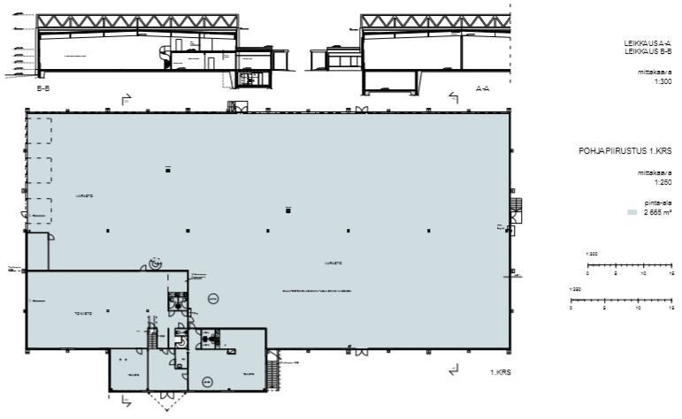 Varasto: 2223 m2, vapaa korkeus n.6m, lattian kantavuus 2500 kg/m², 2 lasktaustaskua ja sisäänajoramppi nosto-ovella. Nosto-oven mitat 3,1 m x 3 m