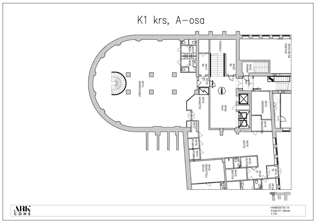 Näyttävä ravintolatila täysin saneeratussa funkkiskiinteistössä tarjoaa erinomaisen mahdollisuuden luoda laadukas ja persoonallinen ravintolakokonaisuus keskelle Sörnäisten vilkasta kaupunkikuvaa. Ensimmäisen kerroksen tila on helposti muokattavissa erilaisiin konsepteihin, ja sen voi yhdistää sujuvasti K1‑kerroksen laajemman ravintolatilan kanssa.
