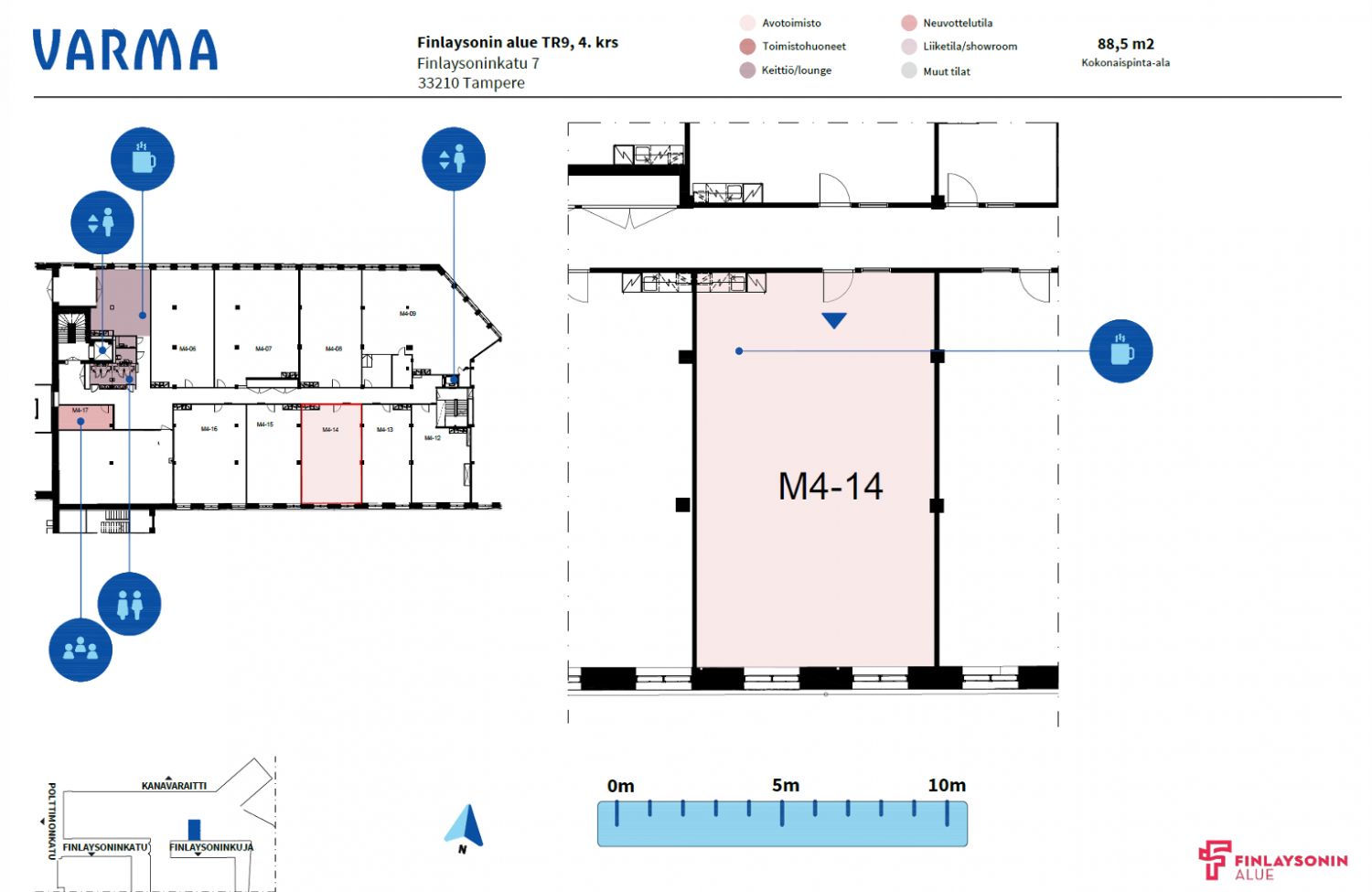 Vuokrattavana heti käyttövalmista toimistotilaa halutulla Finlaysonin alueella. Useita erikokoisia toimistotiloja kiinteistön 3. ja 4. kerroksessa. Tilat ovat avaria ja niissä on oma minikeittiö. Vuokralaisten yhteiskäytössä on tyylikkäät neuvottelutilat sekä taukokeittiöt ja wc-tilat.