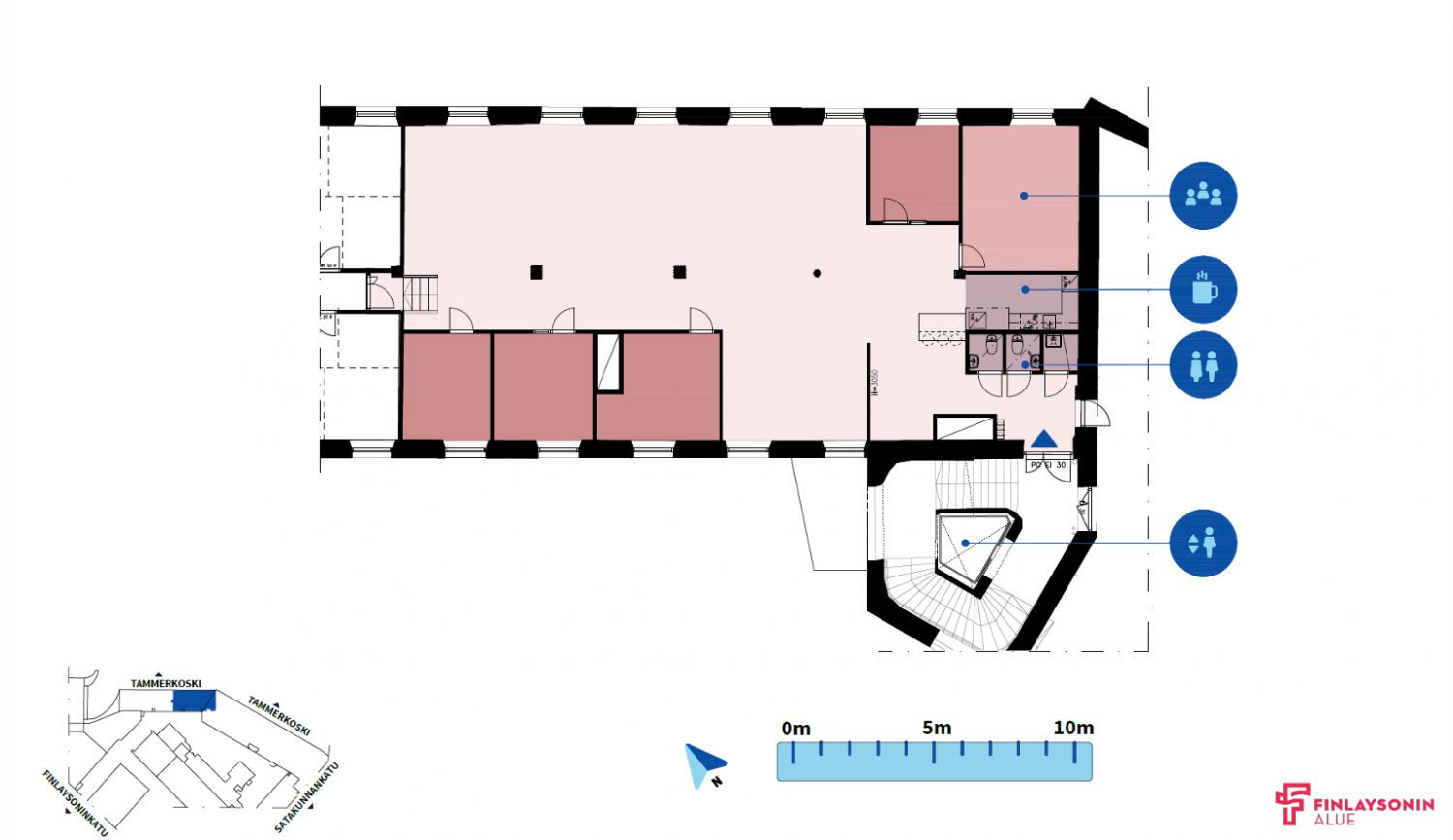 Tilat sijaitsevat arvostetulla ja historiallisella Finlaysonin alueella. Finlaysonin alue on lähellä kaikkea, hyvien yhteyksien varrella ja tarjoaa näin yrityksille arvostettua toimitilaa.