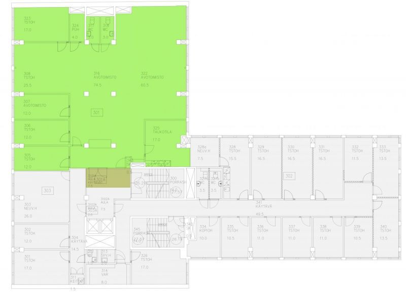 Siisti 3. kerroksen 247,5 m² avotoimisto muutamalla neuvotteluhuoneella. Lisäksi 8 m² aula.