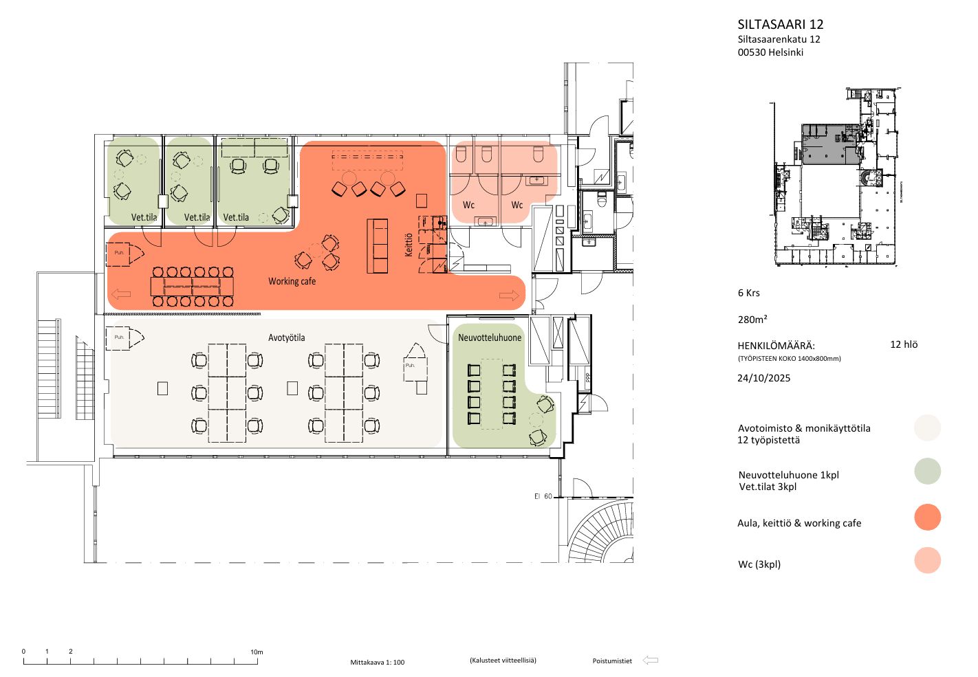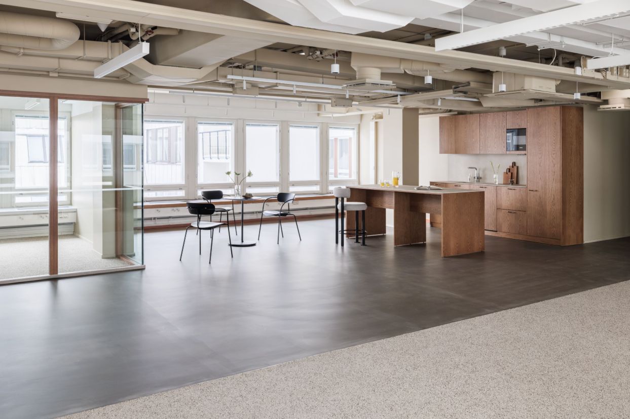 Kokonaisuus yhdistää avaran avotilan ja kolme erikokoista työhuonetta, jotka soveltuvat erinomaisesti sekä tiimityöhön että keskittymistä vaativiin tehtäviin. Käytännöllinen neuvotteluhuone palvelee 8–10 henkilön tapaamisia, ja viihtyisä avokeittiö kutsuu arjen kohtaamisiin. Tilasta löytyvät myös kolme erillistä WC:tä, jotka tuovat arkeen sujuvuutta ja mukavuutta.