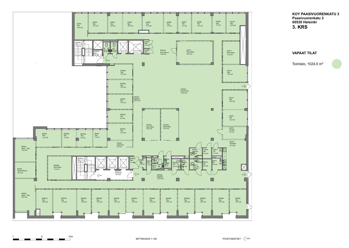 Koko kolmannen kerroksen 1024,5 m²:n toimistokokonaisuus soveltuu erinomaisesti noin 65 henkilön käyttöön. Tila tarjoaa mahdollisuuden rakentaa yritykselle juuri sen tarpeisiin sopivan kokonaisuuden. Avarat työskentelyalueet, erilliset huoneet tai näyttävät asiakastilat yhdistyvät täällä luontevasti.