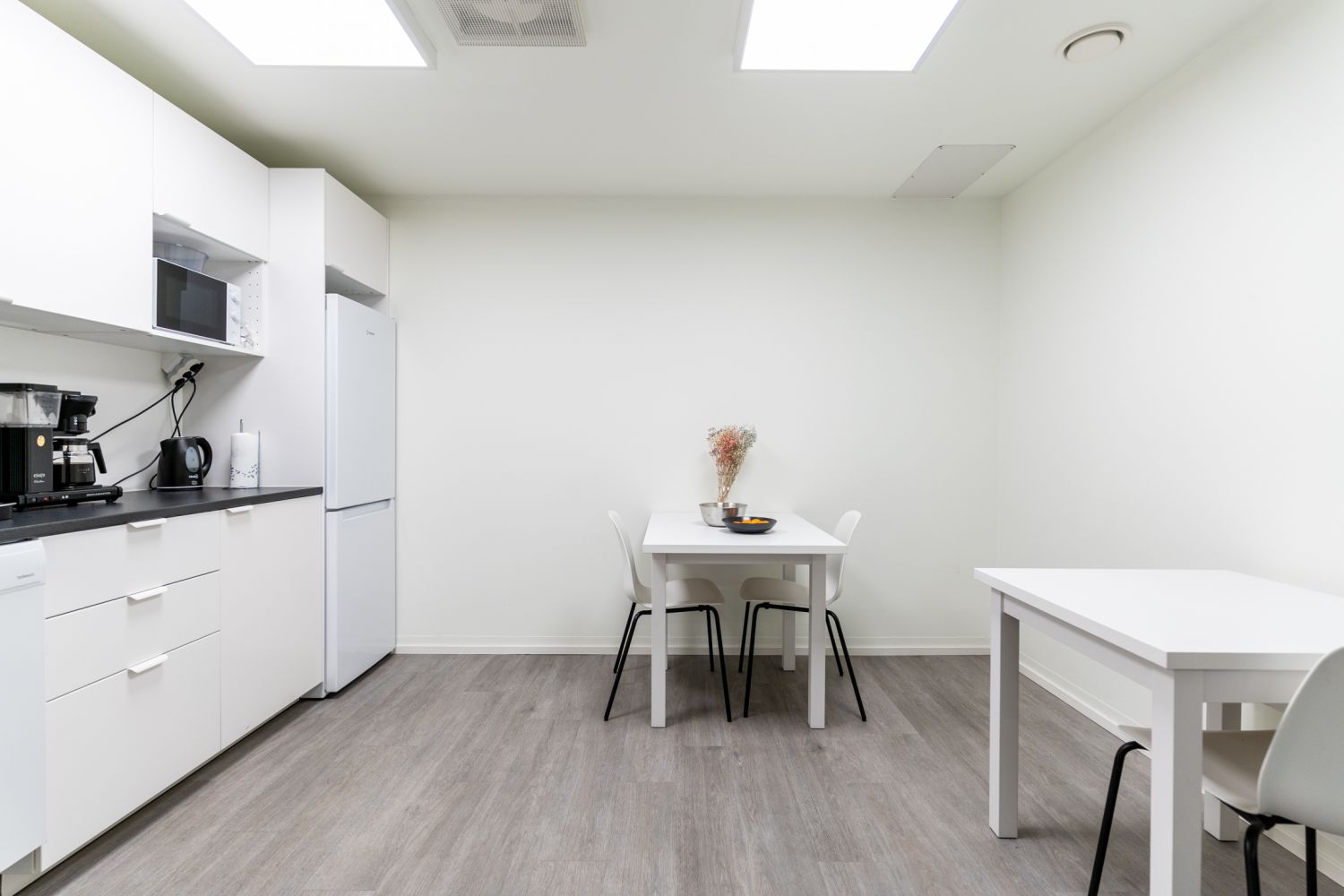 Sisäänkäynti rakennukseen katutasolta, toimisto sijaitsee rakennuksen toisessa kerroksessa, jonne pääsee hissillä.