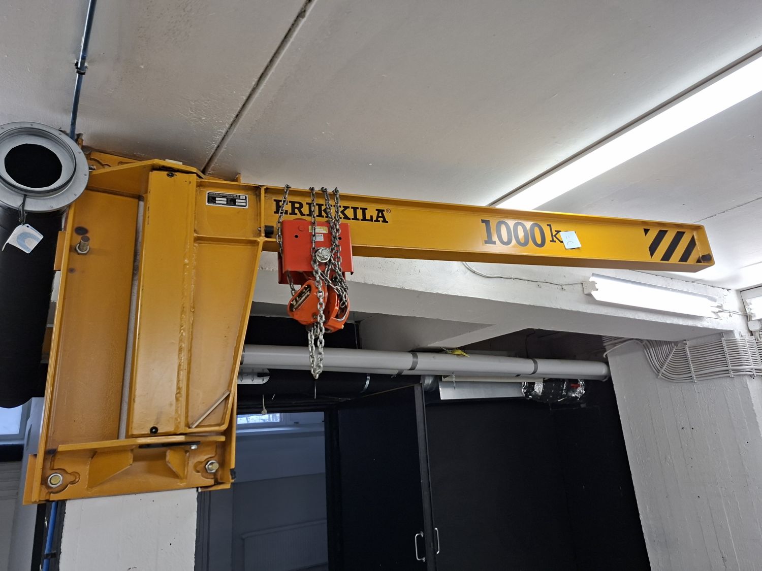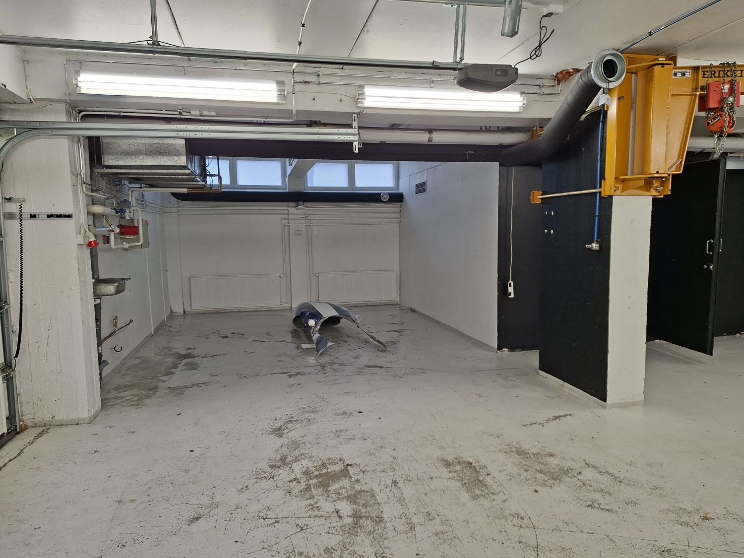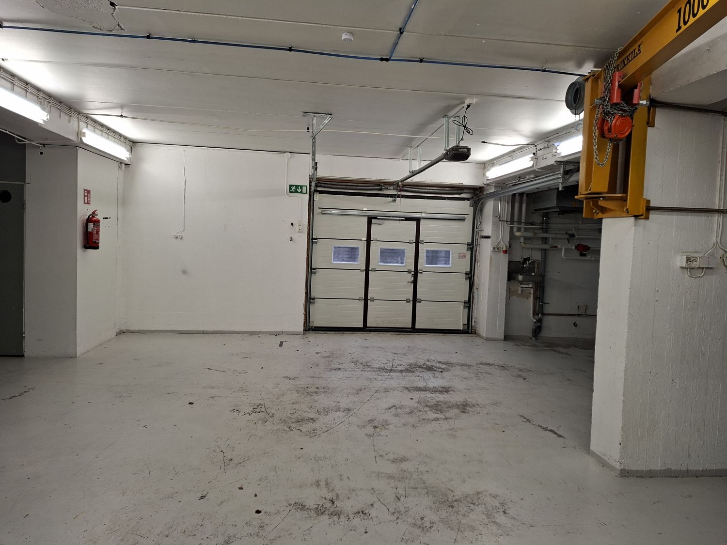 Tilassa nosto-ovi, vesipiste, toimistohuone, voimavirta, kompressori, nosturi 1000kg, yhteiskäyttöinen käyntiovi ja wc.