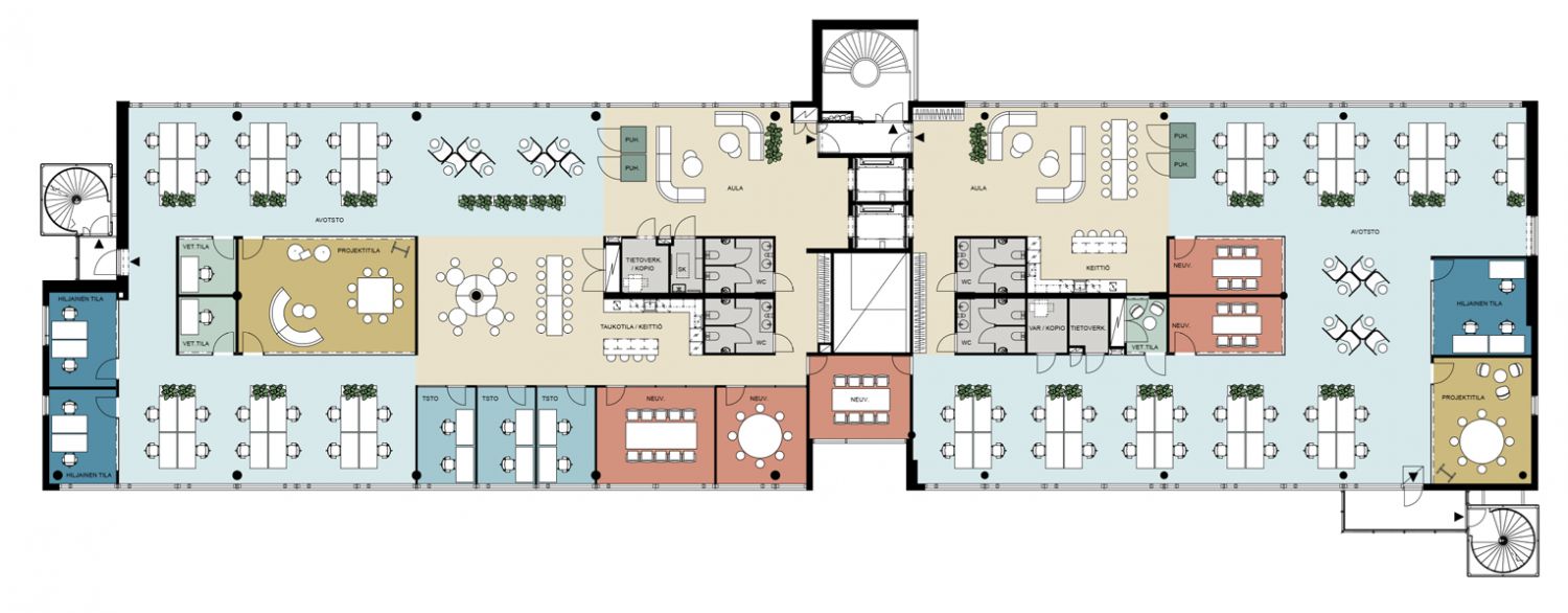 Yhteiset tilat: Keskellä sijaitseva keittiö, taukotila ja aula tarjoavat runsaasti epävirallisia istumapaikkoja (noin 30–40 paikkaa), jotka mahdollistavat joustavan työskentelyn.