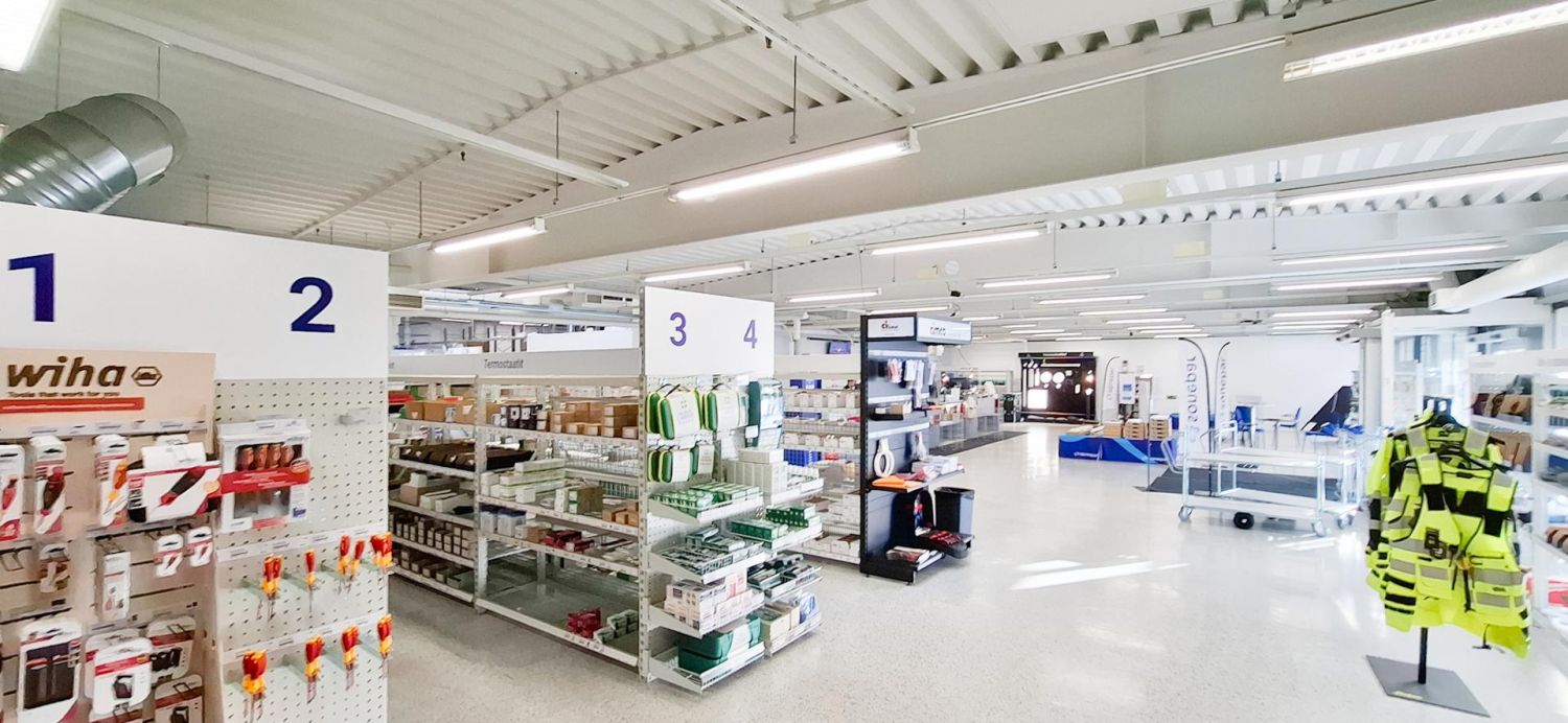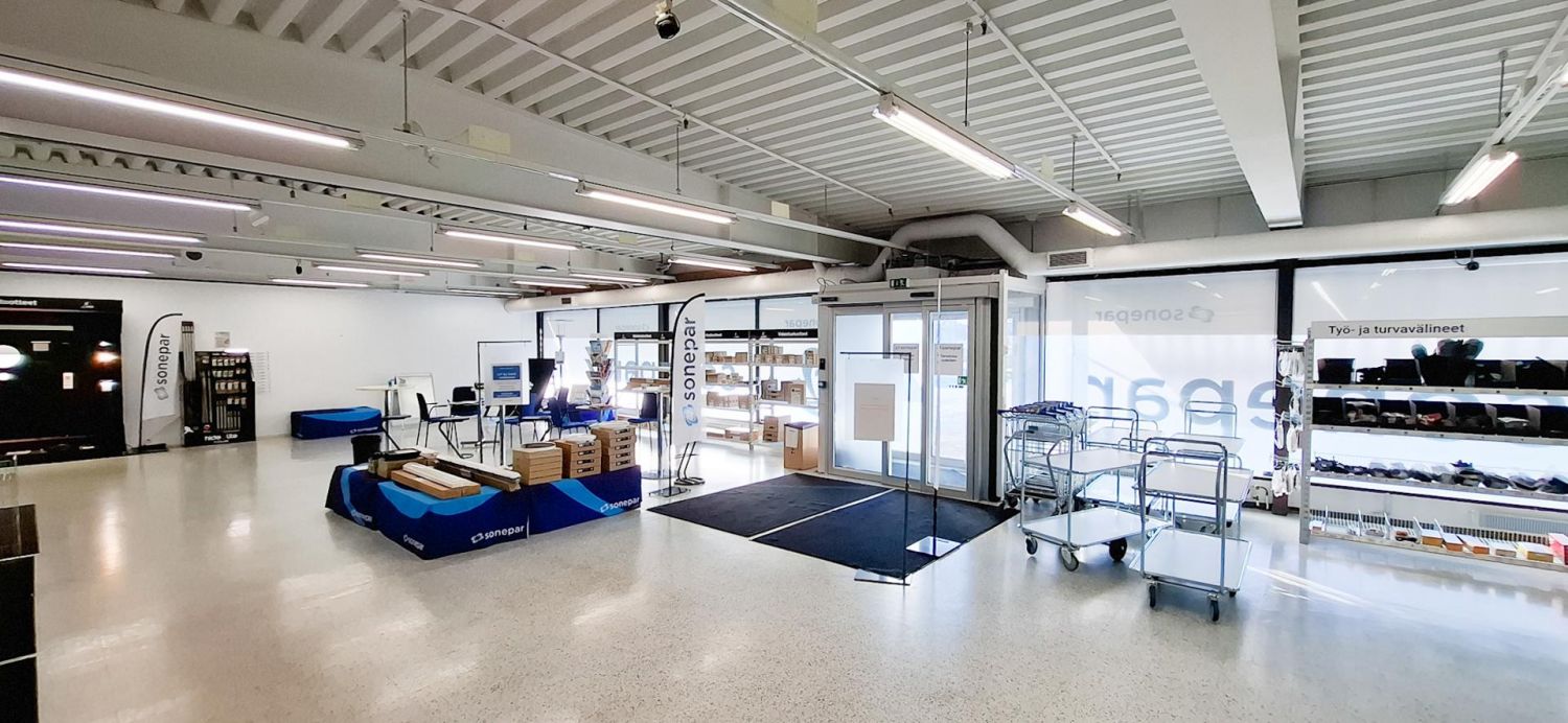 Myymälä on sisäänkäynti tilan keskellä olevista liukuovista ja isot ikkunat antavat hyvä näkyvyyden vilkkaasti liikennöidylle Vasarakadulle.