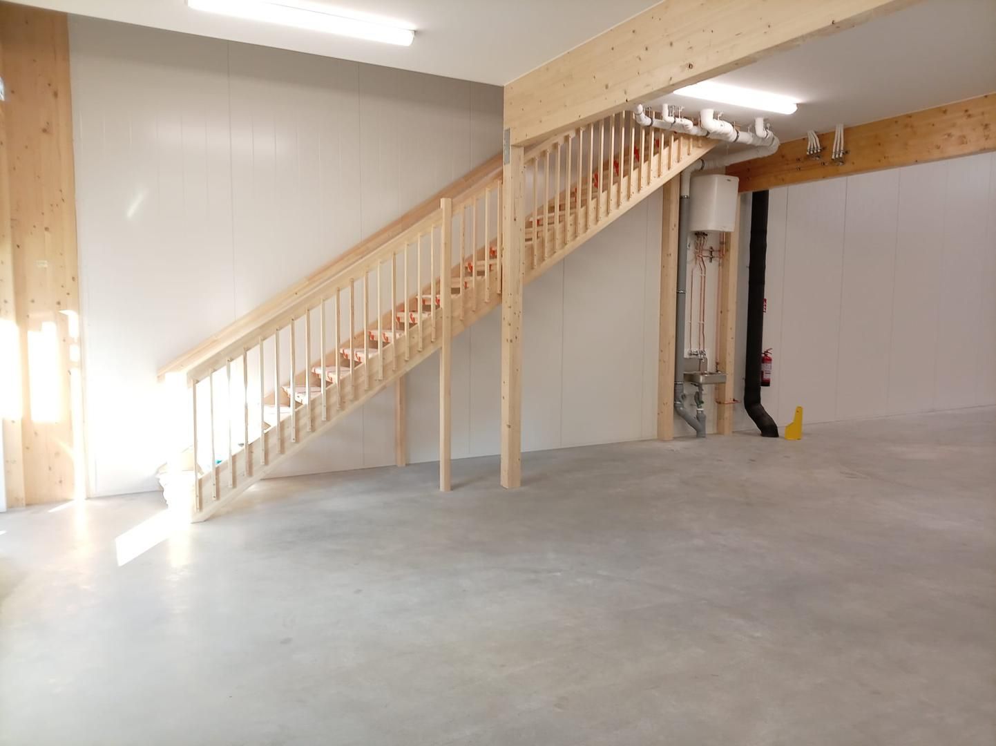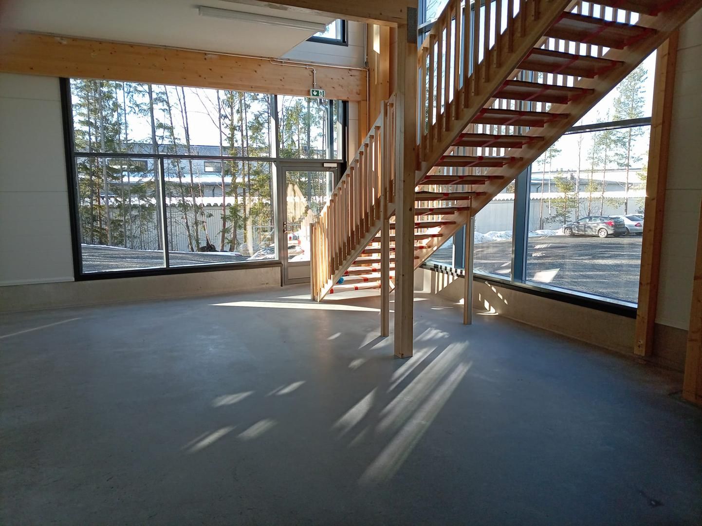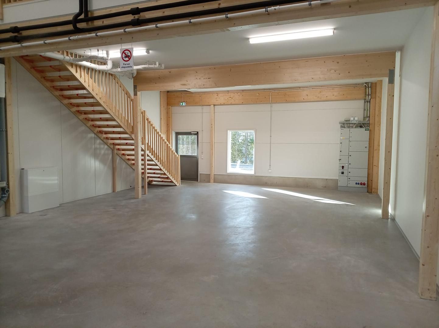 Päätyhalli noin 500m2 näyttävällä kulmatoimistolla (kuva vielä puuttuu). Avointa ja korkeaa hallitilaa 317m2 ja erillinen varastotila 63m2, sekä toimistoa parvella yli 100m2.