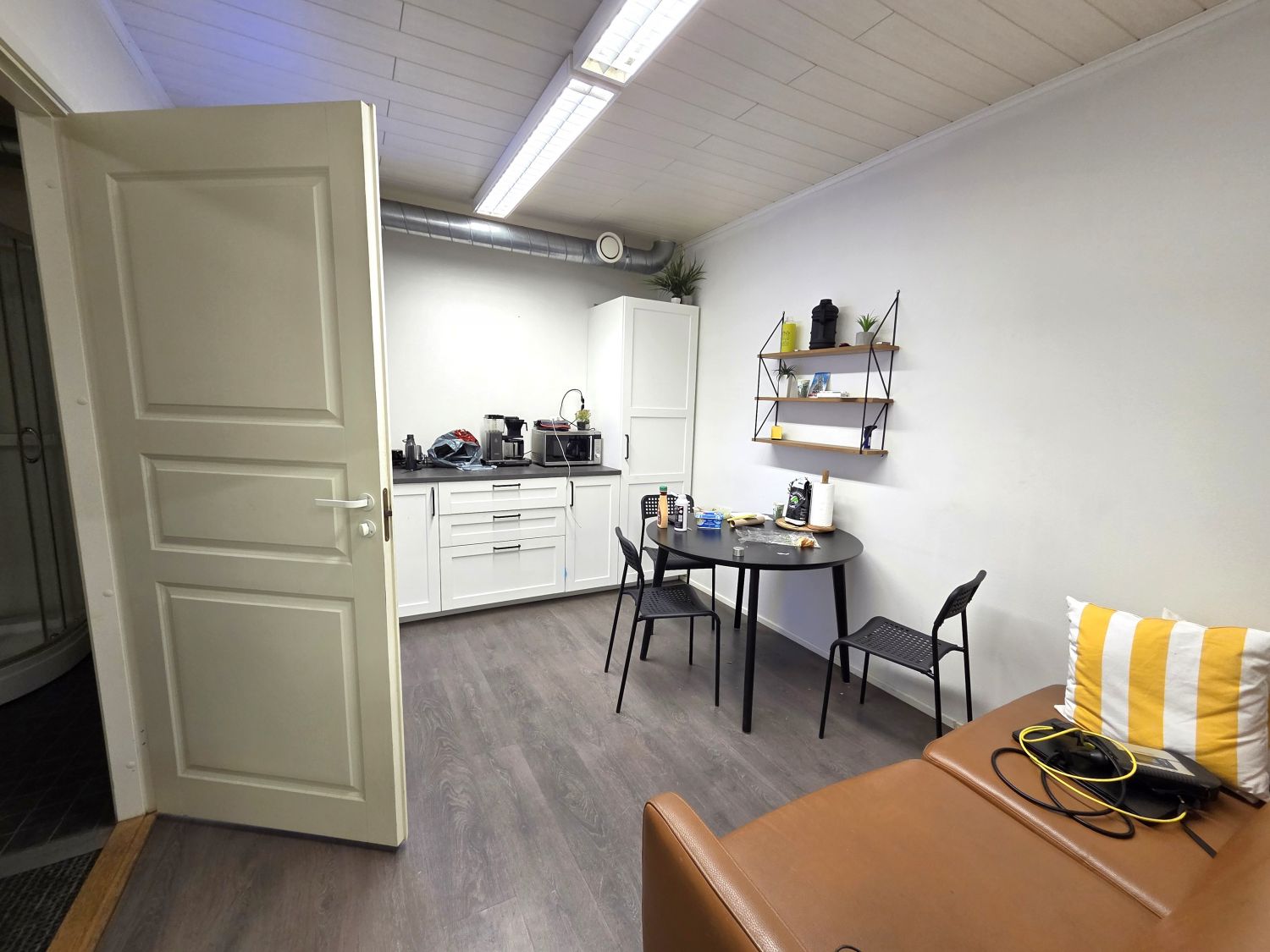 Tilassa on pieni toimistohuone ja pukuhuonetila (wc+suihku) sekä näiden päällä varastoparvi. Pihatilaa saatavilla sopimuksen mukaan.