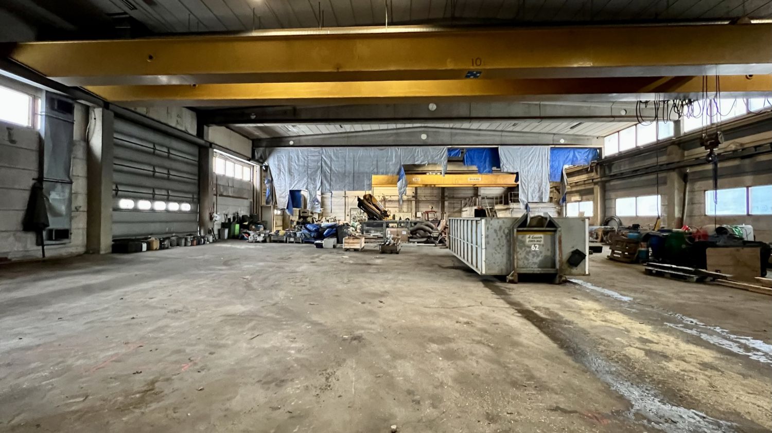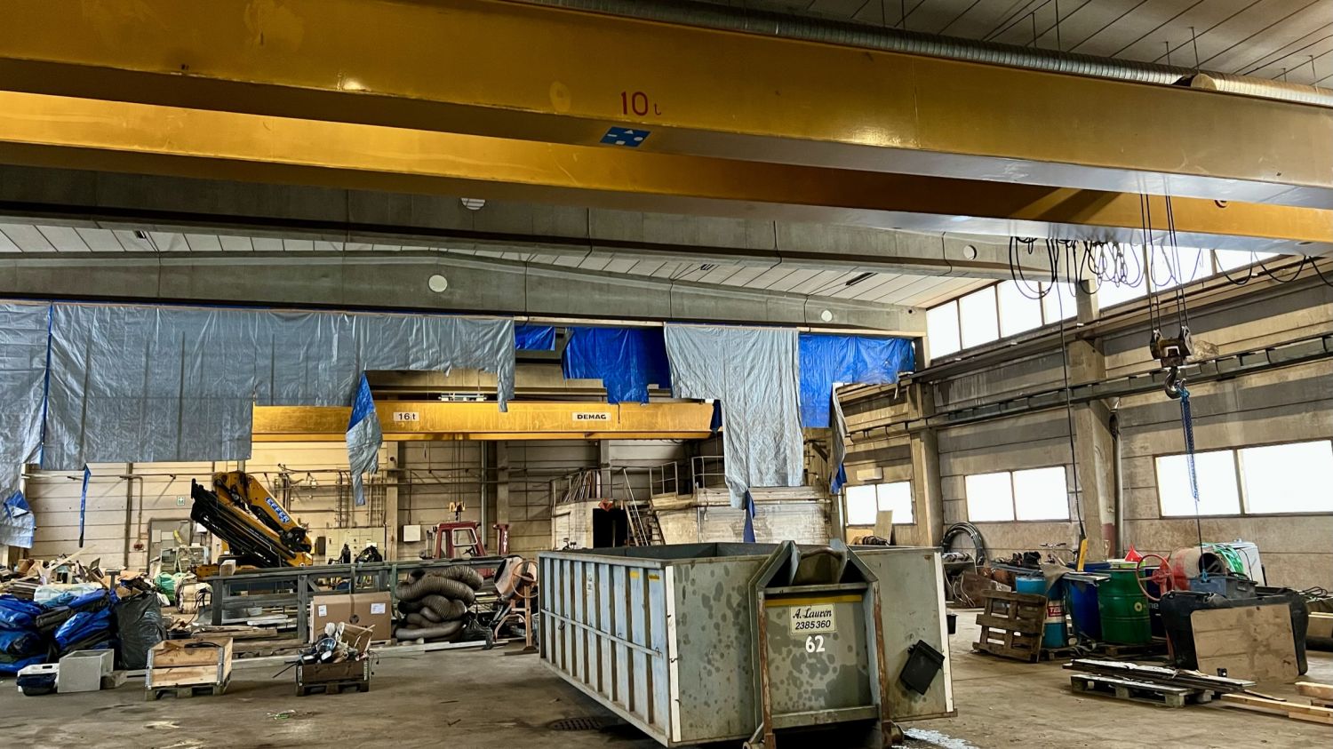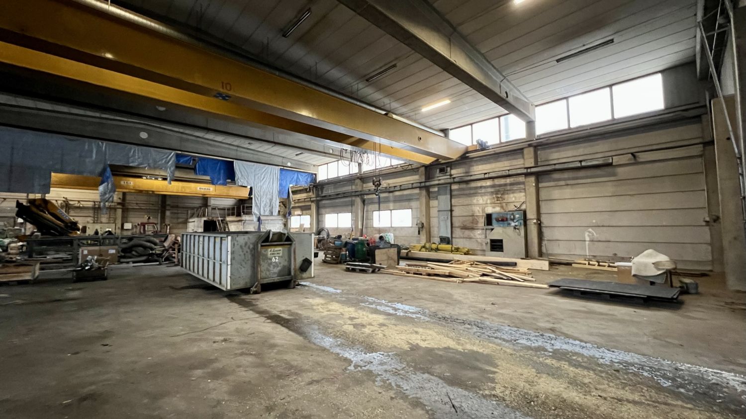 Noin 1040m2 tuotantohallissa on kaksi isoa ovea, 2 lattiakaivoa, sekä kaksi siltanosturia( 16t ja 10t ). Hallin vapaa korkeus nosturin palkkiin on 5m. Hallin vapaa korkeus muuten 6,5m.