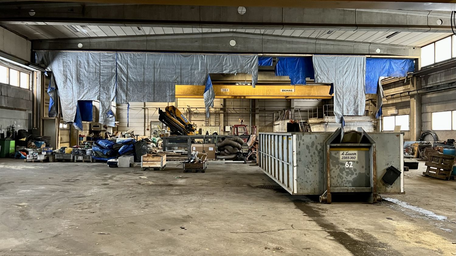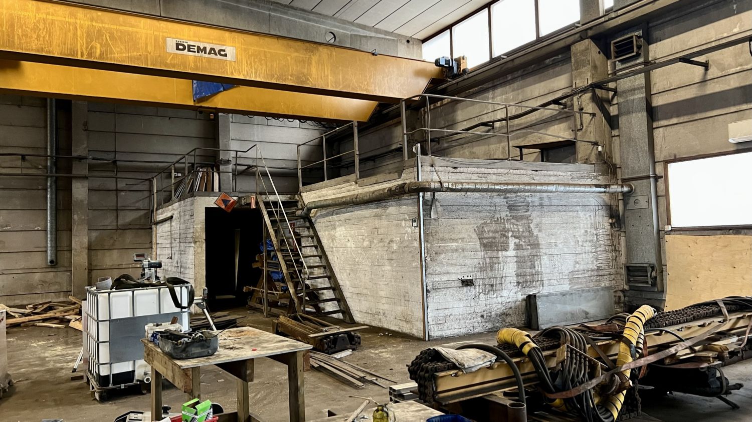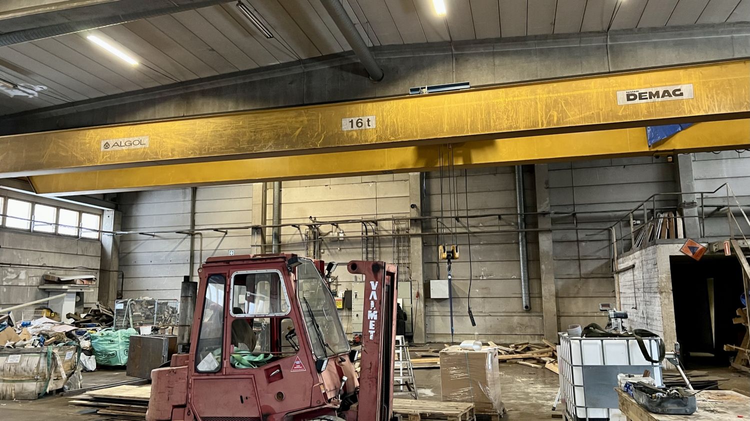 Noin 1040m2 tuotantohallissa on kaksi isoa ovea, 2 lattiakaivoa, sekä kaksi siltanosturia( 16t ja 10t ). Hallin vapaa korkeus nosturin palkkiin on 5m. Hallin vapaa korkeus muuten 6,5m.