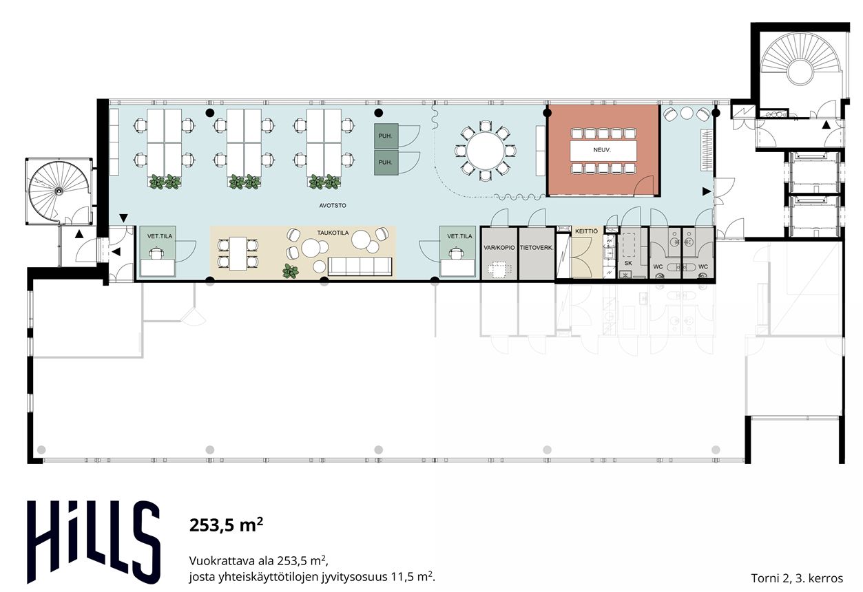 Tarjolla on tehokas ja laadukas 3. kerroksen toimistotila, joka yhdistää avaran monitilaympäristön ja rauhalliset vetäytymistilat. Tämä tila on suunniteltu tukemaan nykyaikaista työkulttuuria, jossa painottuvat sekä yhteistyö että keskittymistä vaativa työ.