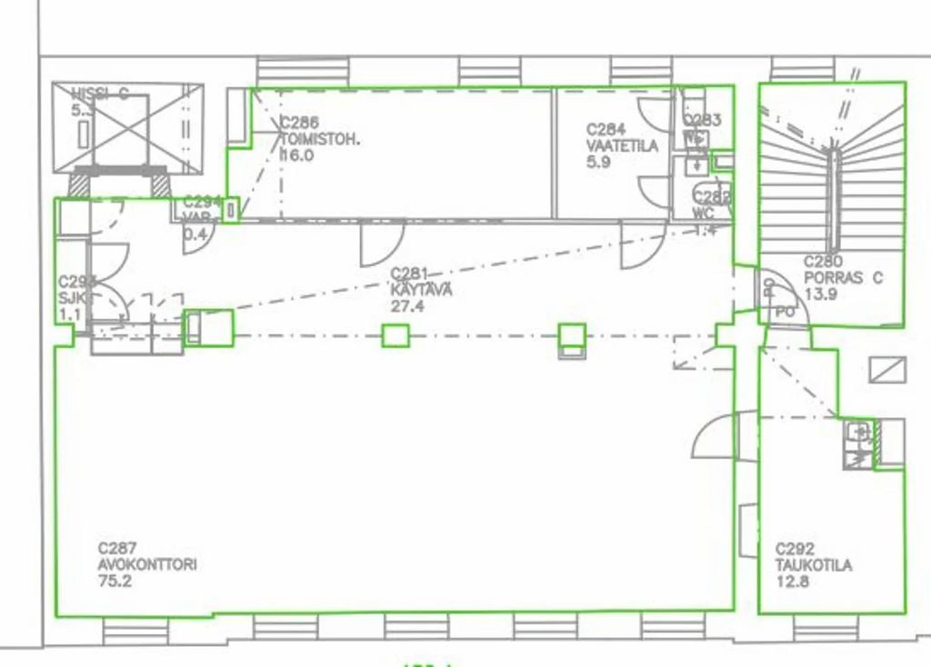 Tämä 140 m² toimistotila sijaitsee C-portaan 2. kerroksessa. Toimistossa on avotilaa, yksi toimistohuone, keittiö-/taukotila sekä omat wc-tilat. Tilaa on mahdollista remontoida uudelle vuokralaiselle.