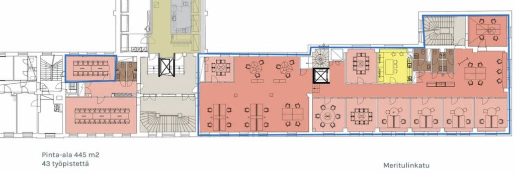 Tämä 494 m² toimistotila sijaitsee kiinteistön 4. kerroksessa. Toimistossa on huoneita, avotilaa sekä omat keittiö- ja wc-tilat. Tilasta on hienot merinäkymät. Neliömäärään sisältyy jyvitys yhteiskäyttöisistä tiloista.