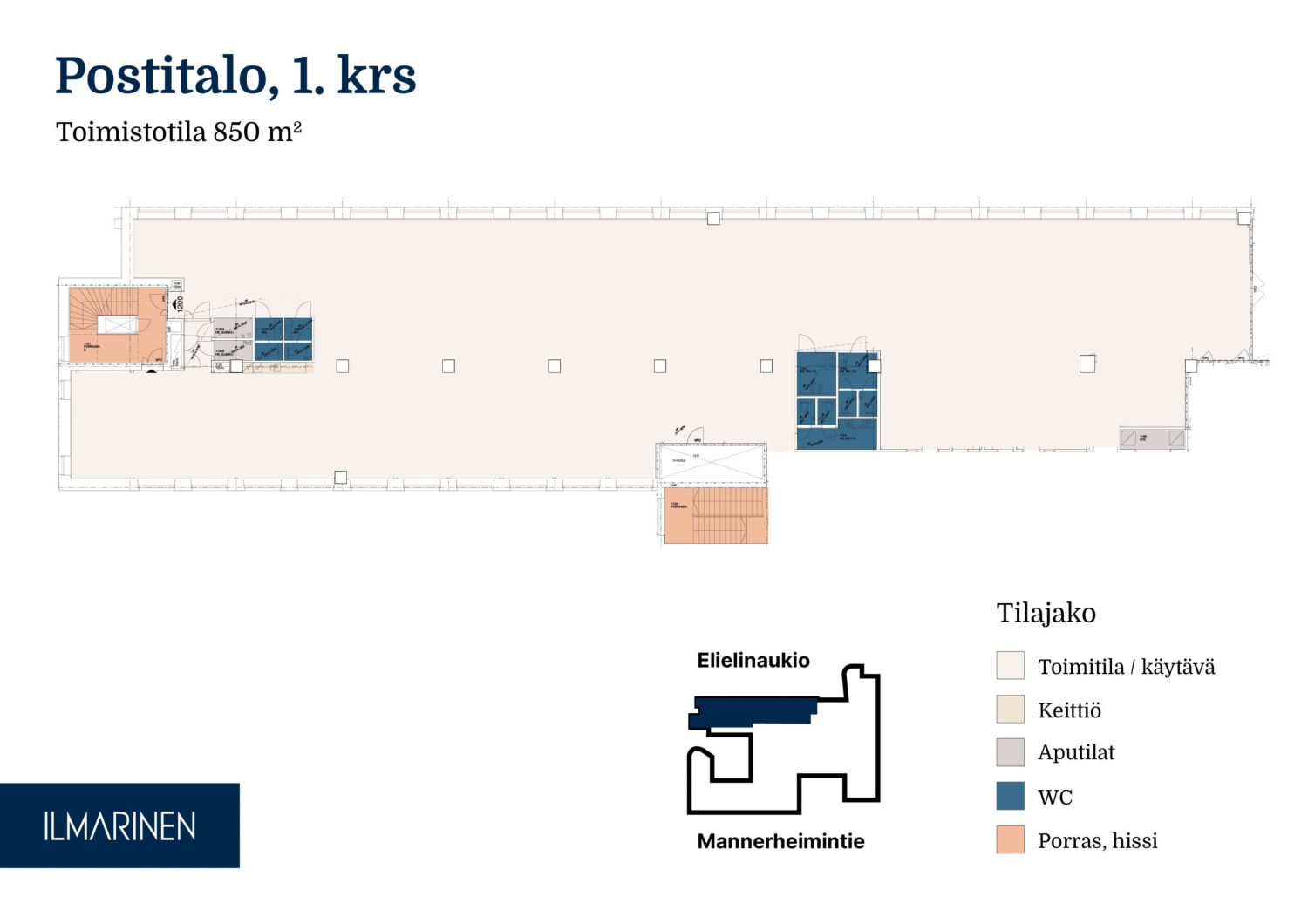 Monipuolinen 850 m² toimitila Postitalon ensimmäisessä kerroksessa. Tilassa on kolme erillistä sisäänkäyntiä sekä tavarahissiyhteys suoraan huoltopihalta, mikä tekee arjen logistiikasta sujuvaa. Koko tilan matkalta avautuvat ikkunat Elielinaukiolle tuovat runsaasti luonnonvaloa. Runsas huonejako mahdollistaa joustavat tilaratkaisut soveltuen erinomaisesti monenlaiseen toimisto- tai palvelukäyttöön.