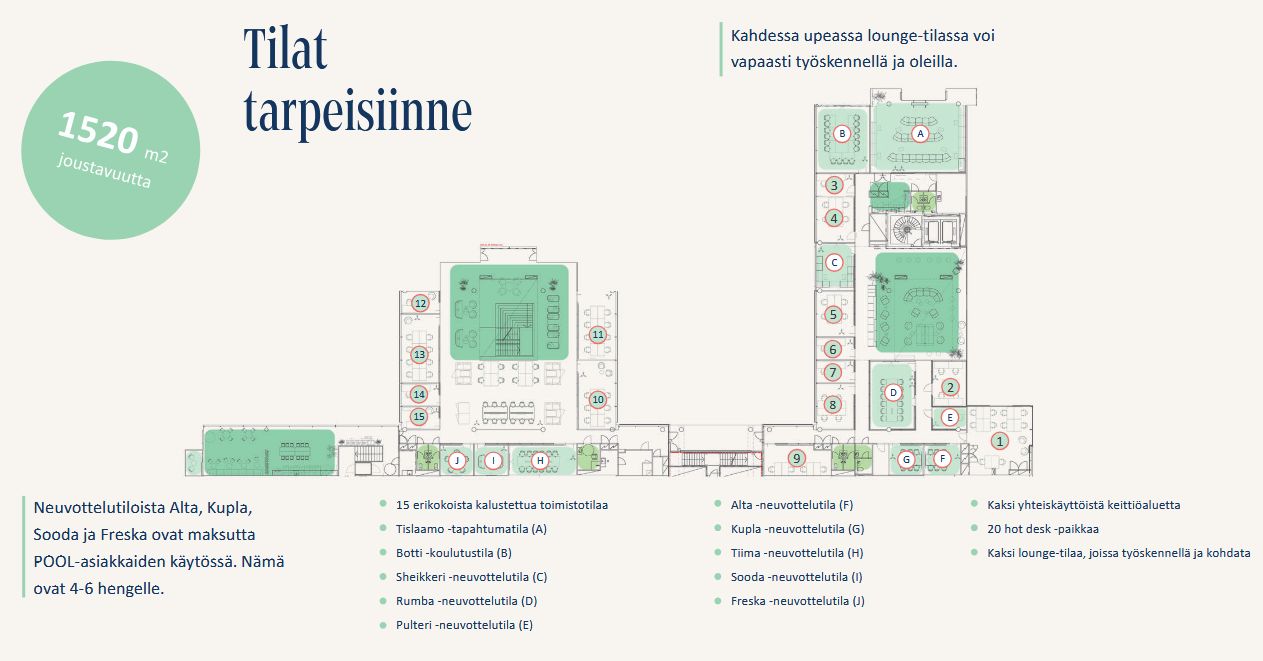 Valmiiksi kalustettu ja sisustettu toimisto, sisältäen kaikki sujuvaan työntekoon liittyvät palvelut. POOLin studiovuokraan sisältyvät valmiit verkkoyhteydet, kopiointi- ja tulostuspalvelut ja it-tuki. POOLissa on myös oma aulapalvelu ja tyylikkäät taukotilat pienpaahtimon kahvi- tai teetarjoiluineen. Ohessa havainnollistavia kuvia.