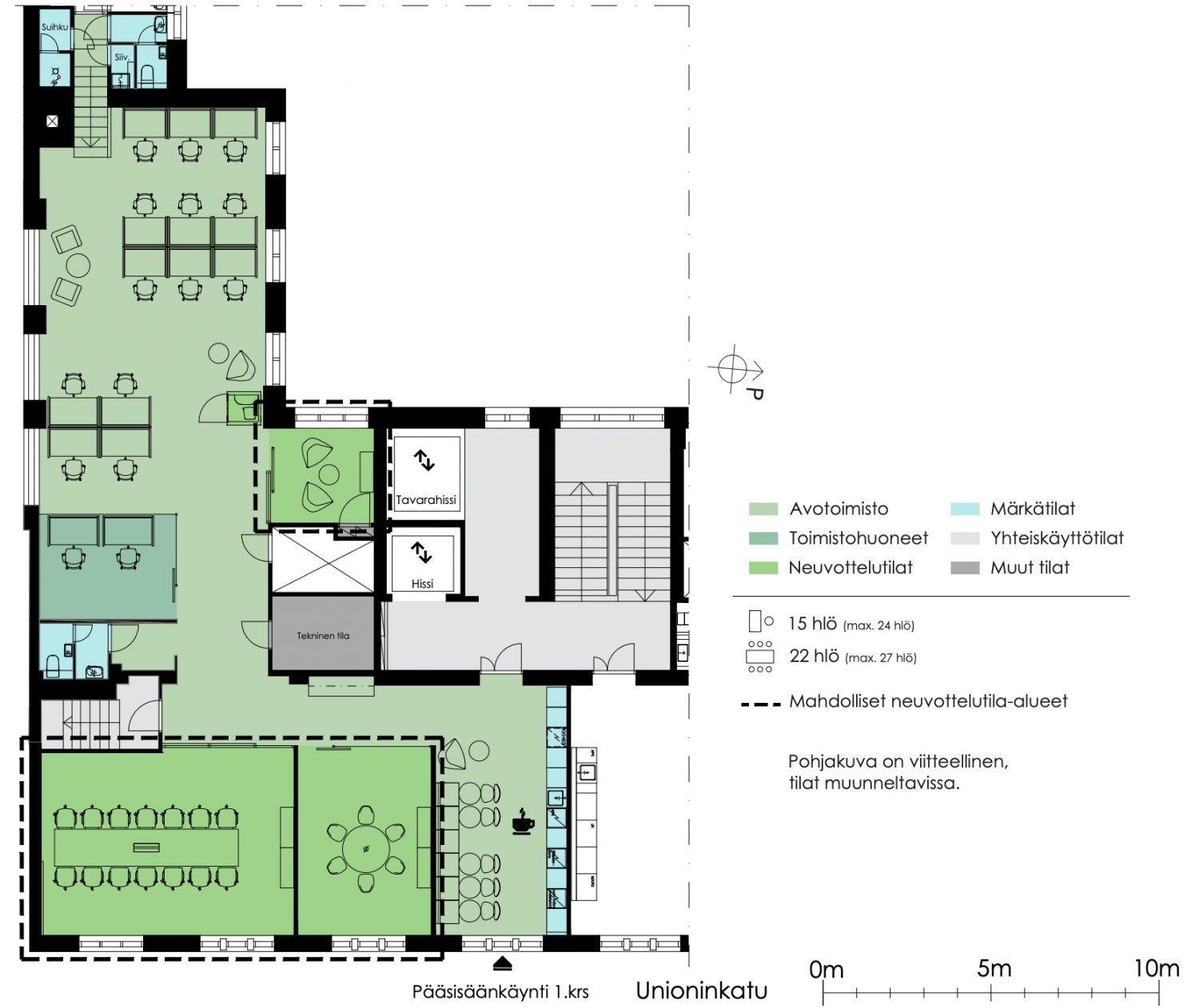 3. kerroksen siisti hybriditoimisto, jossa sekä avotoimistoa että toimistohuoneita. Sijainti lähellä Kauppatoria ja näkymät Unioninkadulle.