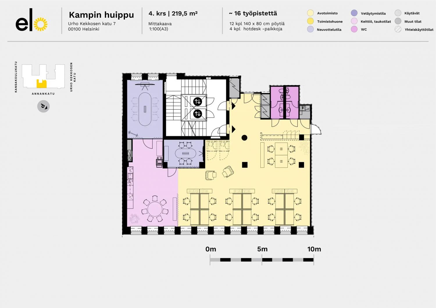 Nyt vuokrattavissa valoisa neljännen kerroksen toimisto, jossa avotyöalue sekä kaksi neuvottelutilaa. Lisäksi tilaan rakennetaan oma uusi keittiö ja näkymät tilasta ovat Annankadun suuntaan.