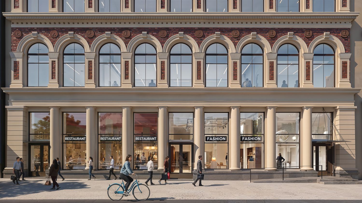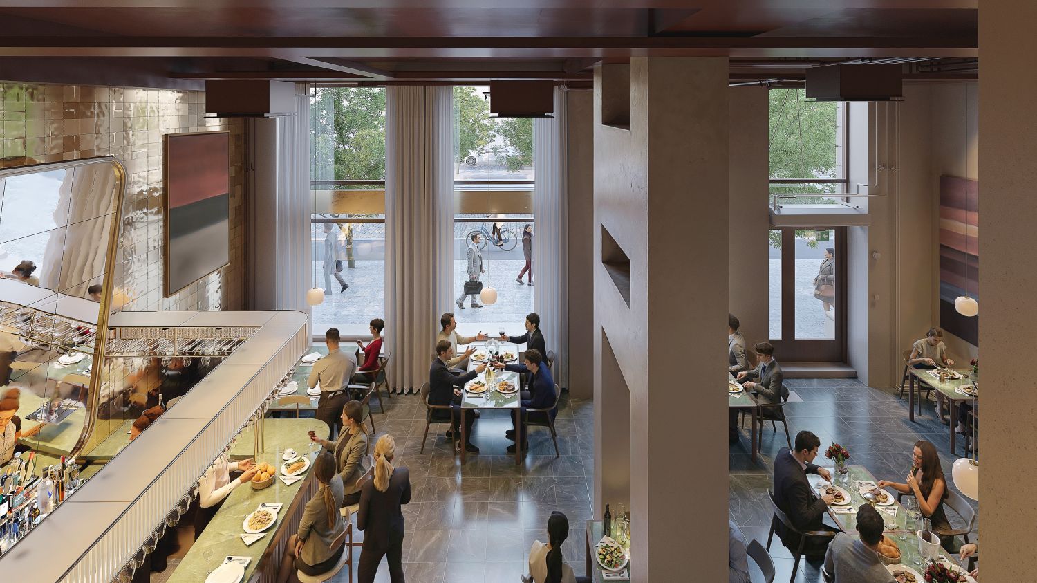 Upea kaksitasoinen ravintolatila, jossa on kadun puolella huikea huonekorkeus.