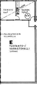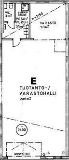 hallitila n. 105 m2, takavarasto ja sos.tila n. 32 m2, 2.kerroksen toimisto ja taukotila 32 m2.