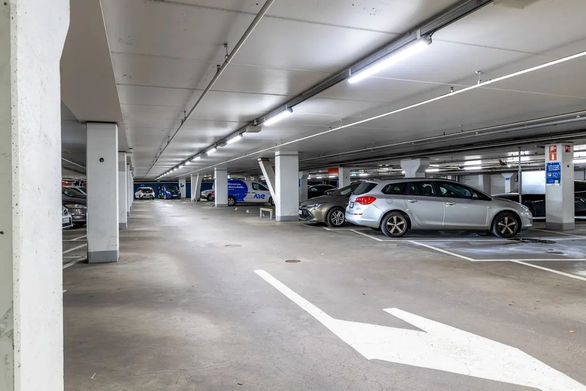 Pysäköinti onnistuu vaivattomasti: paikkoja on runsaasti sekä talon molemmilla puolilla sijaitsevilla pysäköintialueilla että talon alla olevassa pysäköintihallissa.