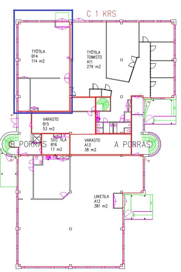 Vuokrattavana monipuolinen 114 m² työ- ja varastokäyttöön soveltuva tila Espoon Muuralassa. Pohjakuvan tila B14. Tämä toimiva kokonaisuus tarjoaa runsaasti mahdollisuuksia erilaisiin käyttötarkoituksiin.