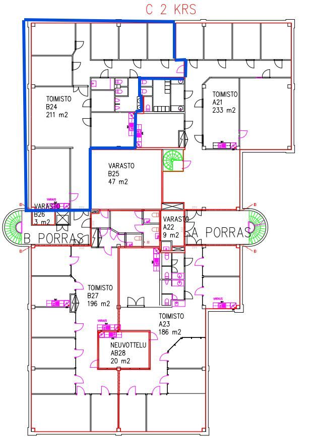 Tämä toimistotila sijaitsee rakennuksen toisessa kerroksessa ja vastaavat pohjakuvan tilaa B24. Tilassa keittiö, sekä 2kpl wc. Kiinteistön pihalla on runsaasti pysäköintitilaa, ja pysäköinti järjestyy sopimuksen mukaan.