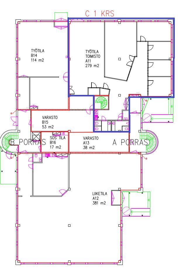 Tämä toimistotila sijaitsee rakennuksen ensimmäisessä kerroksessa ja vastaavat pohjakuvan tilaa A11. Tilassa pieni keittiö, sekä wc:t. Kiinteistön pihalla on runsaasti pysäköintitilaa, ja pysäköinti järjestyy sopimuksen mukaan.