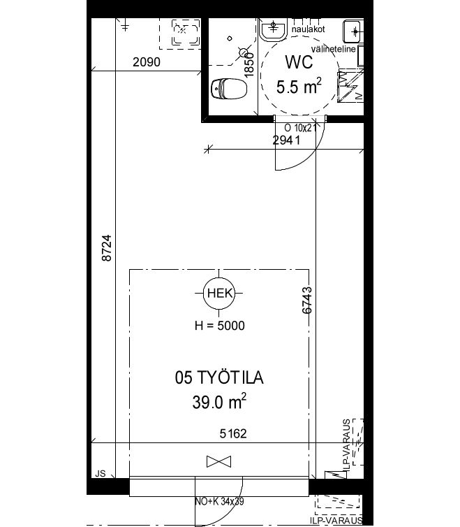 Autolla sisään ajettava tila. Tilamitat: 8,72 (Pituus) 5,16 (Leveys) 5,00 (Korkeus). Ovimitat: 3,40 (Leveys) 3,90 (Korkeus).