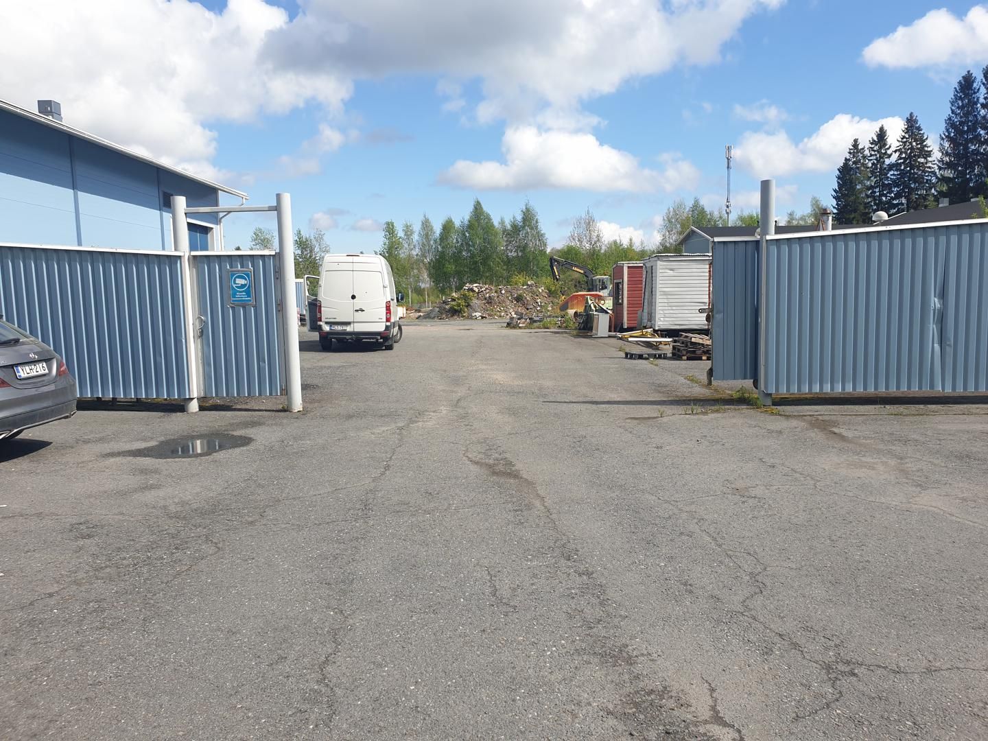 Kiinteistön piha-alue on aidattu. Viereisten tonttien välisissä aidoissa on portit, joten rekalla mahtuu ajamaan ympäri, eikä tarvitse peruuttaa tielle.
