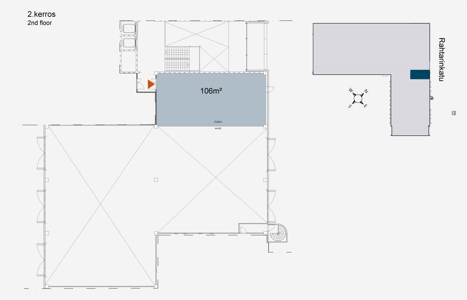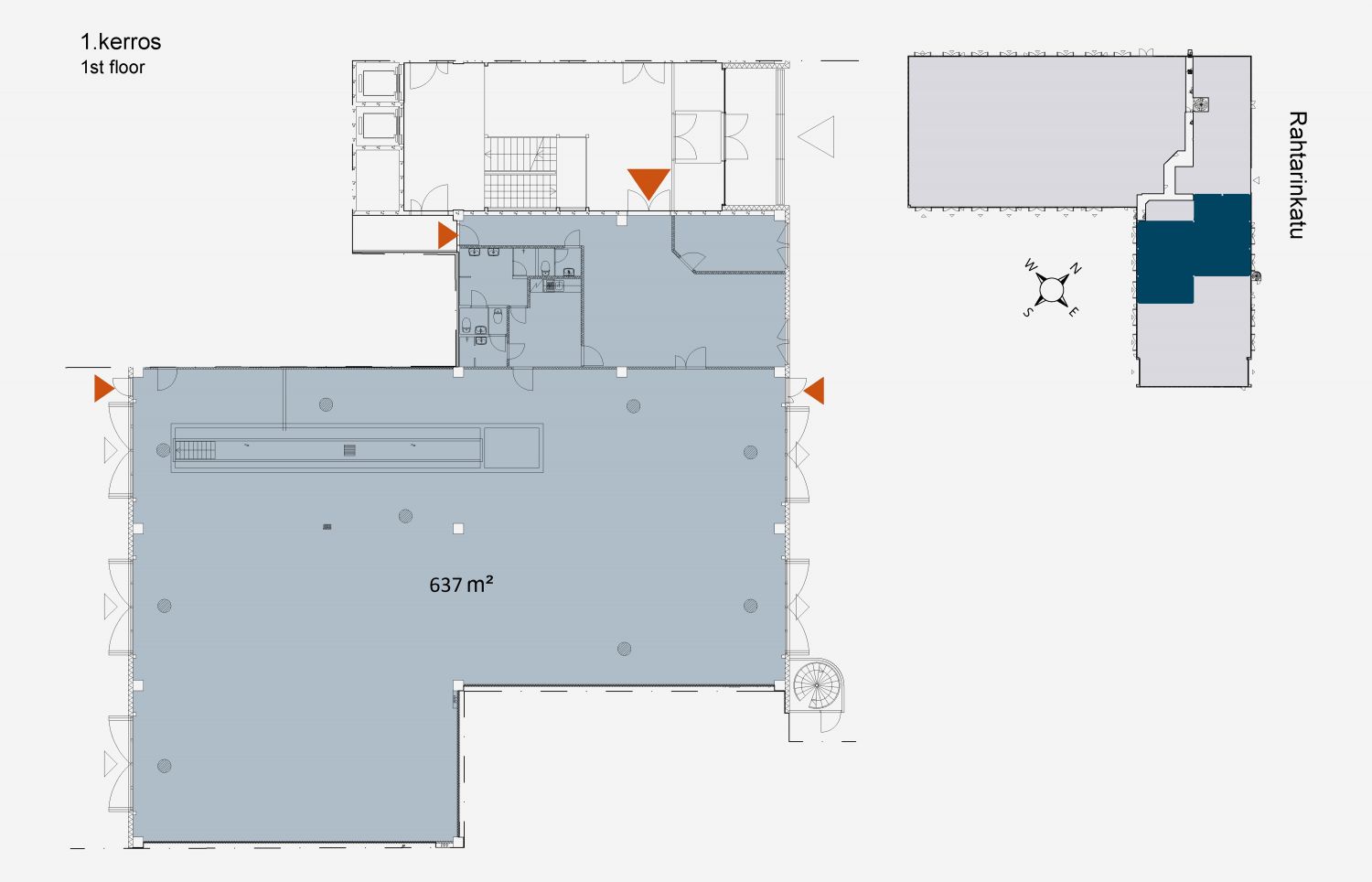 Huoltohallin lisäksi 1. kerroksessa sijaitsevat toimisto-/asiakaspalvelutilat ja 2. kerroksessa on 106 m²:ä säilytykseen sopivaa parvitilaa.